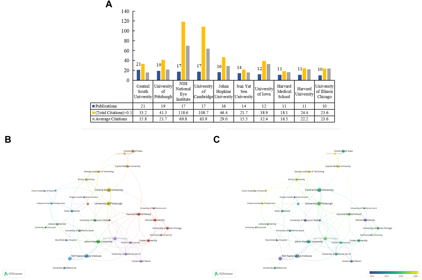 The top 10 prolific institutions and cooperative relationships between institutions in work on the applications of stem cells for glaucoma treatment and research. (A) The numbers of publications, total citations, and average citations in the top 10 institutions. (B) The cooperative network visualization map of institutions working on applications of stem cells for glaucoma treatment and research. Node size indicates the number of publications, and the thickness of the link positively correlates with the cooperation strength. (C) The cooperative network overlay visualization map of institutions for the application of stem cells for glaucoma treatment and research. Blue represents the early research phase, and yellow represents the recent period.