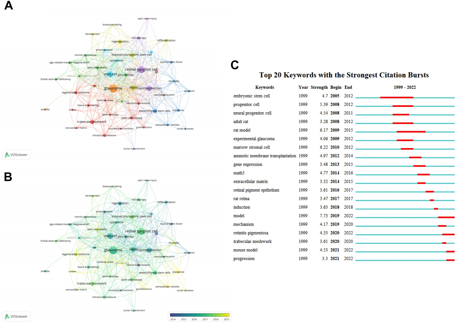 Analysis of keywords related to publications on applications of stem cells for glaucoma treatment and research. (A) The co-occurrence network visualization map of keywords related to the application of stem cells for glaucoma. The keywords were clustered into eight groups according to their colors. Large nodes represent keywords with high frequencies. (B) Keywords are colored according to their appearance for the average time. Blue represents the early stage, and yellow represents the late stage. (C) The top 20 keywords with the strongest citation bursts regarding applications of stem cells for glaucoma from 1999 through 2022. The red segment of the blue line denotes the burst duration of a keyword.