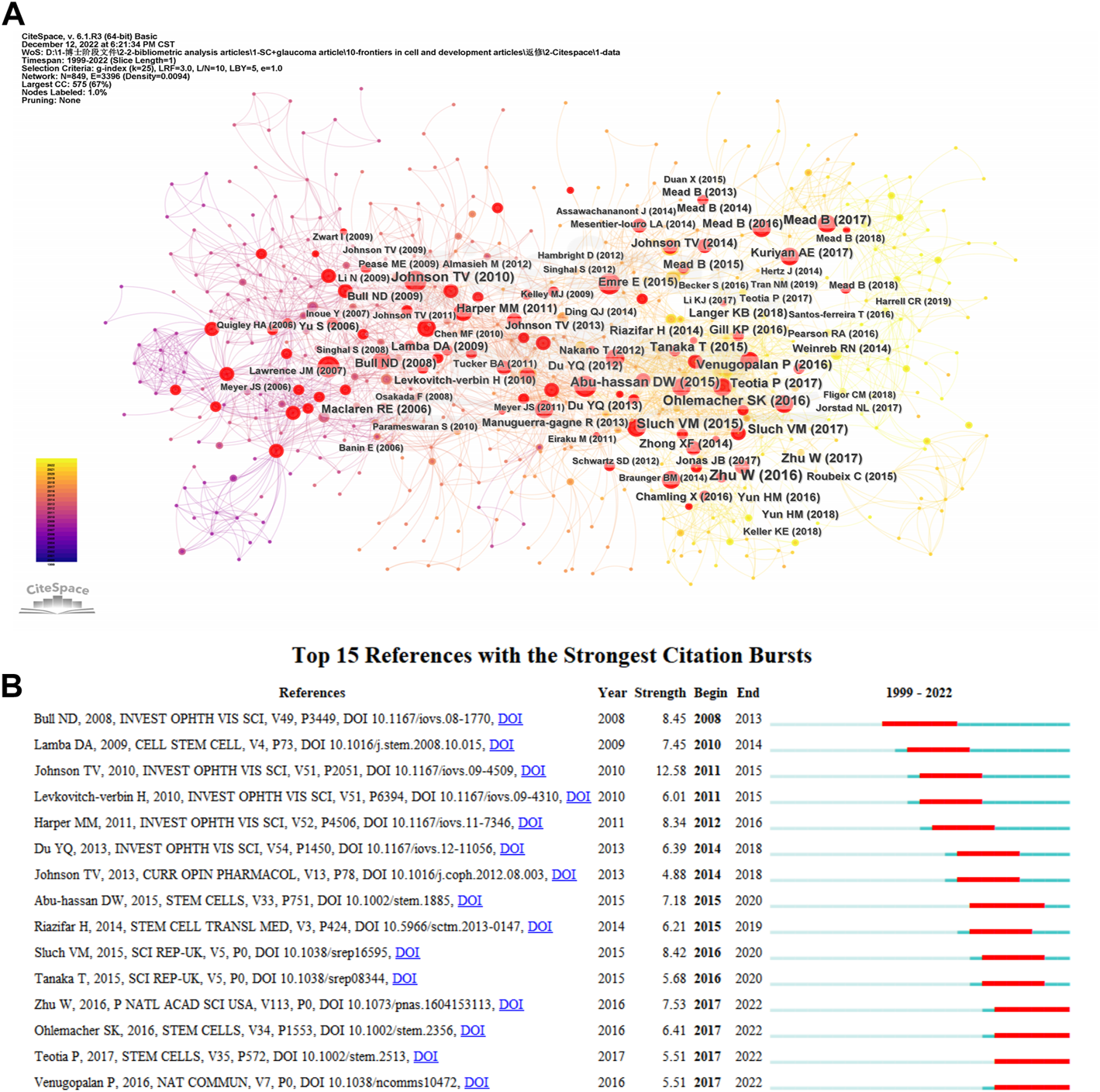 (A) The visual network of references to work on the applications of stem cells for glaucoma treatment and research from 1999 through 2022. (B) The top 15 references with the strongest citation bursts related to applications of stem cells for glaucoma between 1999 and 2022. The blue line represents the time from its first appearance to 2022, the red line represents the burst time.