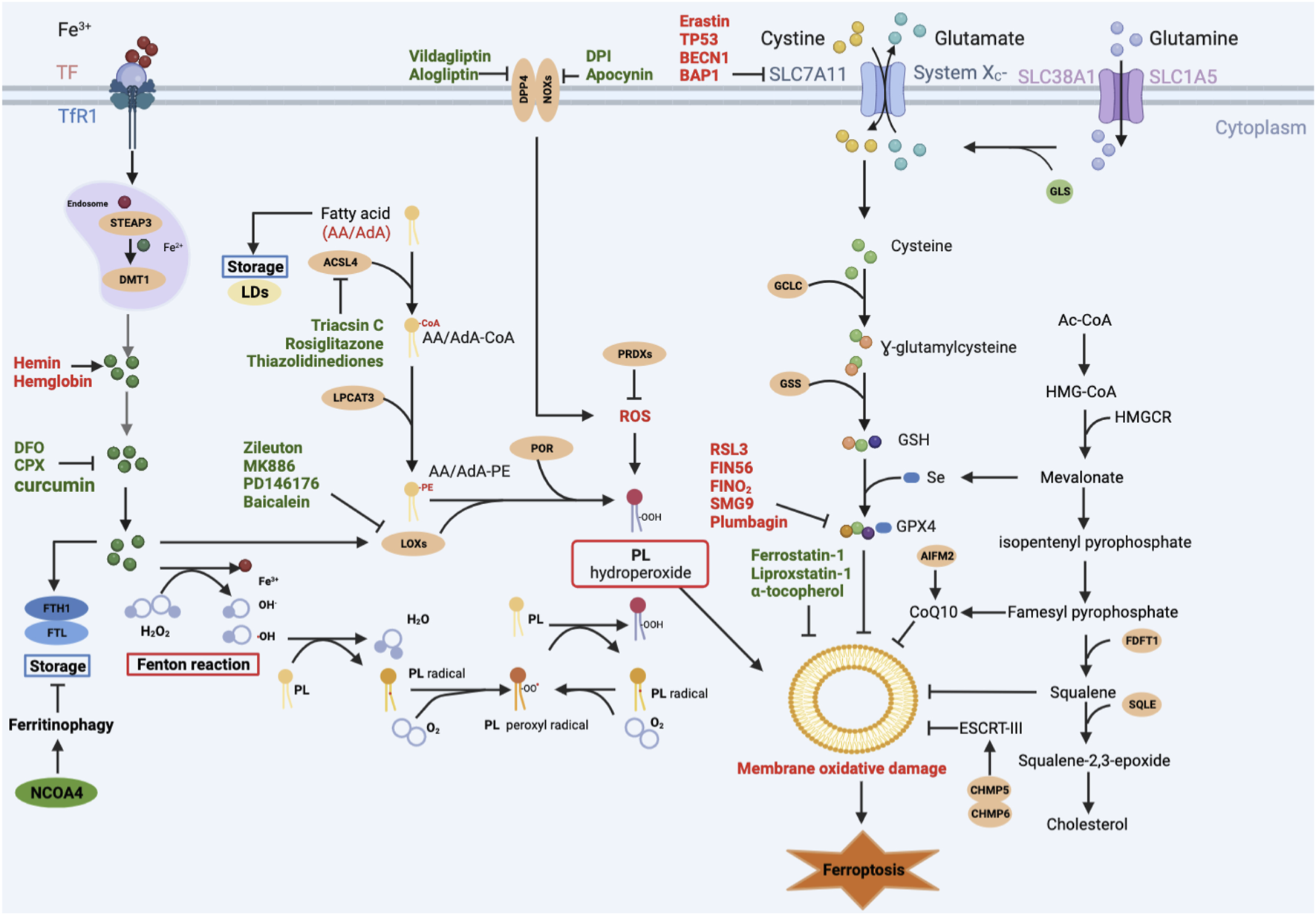 Main signaling pathways of ferroptosis. Ferroptosis can occur through three major pathways: 1) Iron overload: Fe2+ may directly generate excessive lipid reactive oxygen species (ROS) through the Fenton reaction, or Fe2+ acts as a cofactor of lipoxygenase (LOX) or prolyl hydroxylase, leading to lipid peroxidation and oxygen homeostasis. 2) Lipid peroxidation: ACSL4 catalyzes the ligation of CoA into free AA/AdA to form AA/AdA-CoA. AA/AdA-CoA are esterified into PE by LPCAT3 to form AA/AdA-PE. PE-AA/AdA-OOH are produced by the peroxidation of the AA/AdA-PE through non-enzymatically autoxidation (Fenton reaction) or enzyme-mediated pathways (LOXs). 3) Antioxidant systems: the SLC7A11-GSH-GPX4 axis, CoQ10 system, and other antioxidants like AIFM2, squalene. Red-colored: ferroptosis inducers; Green-colored: ferroptosis inhibitors.