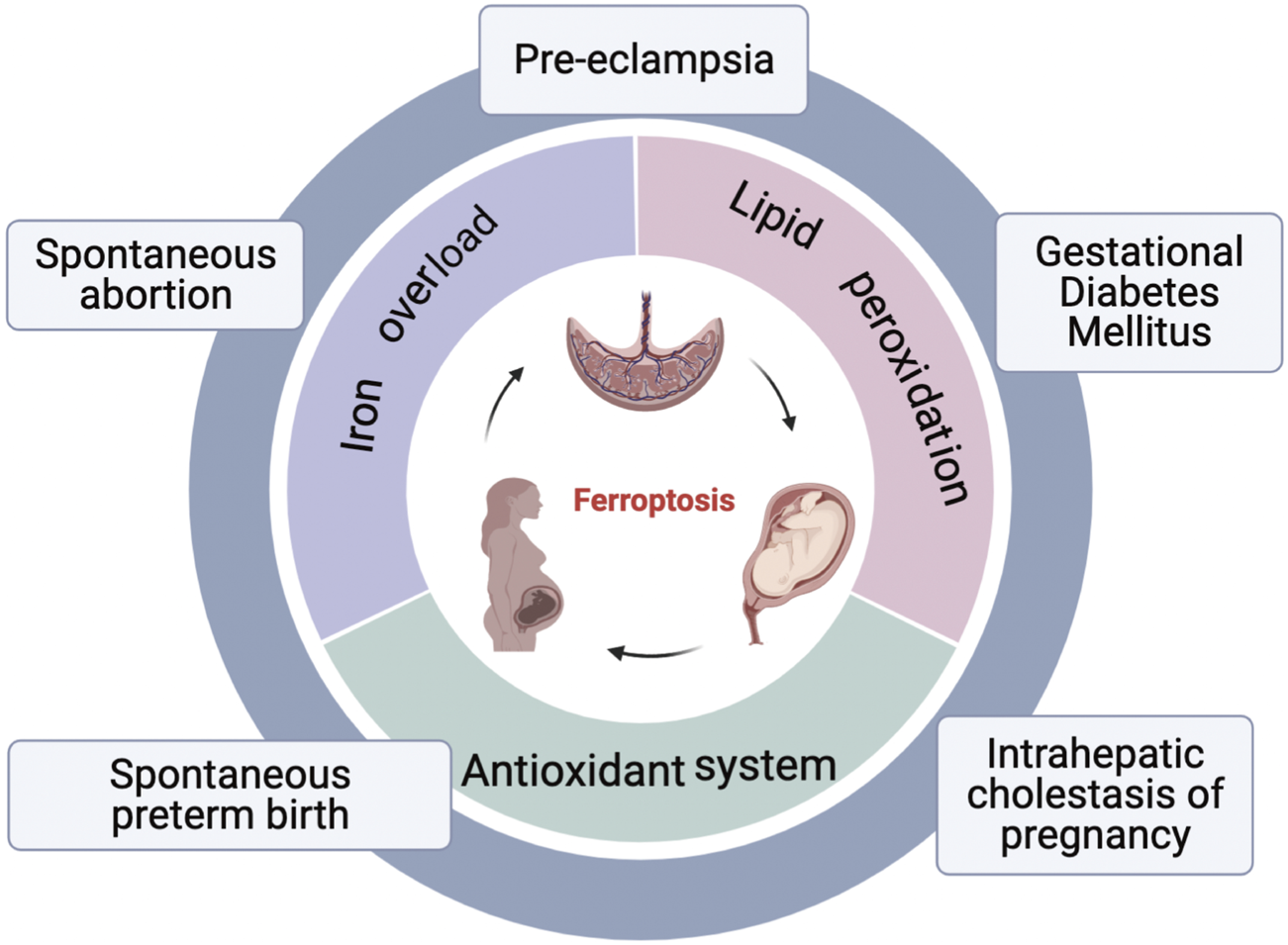 Intrahepatic cholestasis of pregnancy (ICP) is a complication, most occurs in the third trimester, in 0.3%–15% of pregnancies in various populations (Wikström Shemer et al., 2013). It is characterized by pruritus, elevated serum bile acid levels and liver transaminases, leading to meconium-stained amniotic fluid, fetal distress, preterm birth, and stillbirth (Wikström Shemer et al., 2013). There is increasing evidence that oxidative stress induced by bile acids leads to the pathogenesis of ICP (Sanhal et al., 2018). ICP patients had significantly lower levels of Se and GPX4 than normal pregnancies (Reyes et al., 2000; Hu et al., 2015). Moreover, patients with ICP had significantly higher level of MDA (Zhu et al., 2019). Analysis of differentially expressed ferroptosis-related genes in ICP and healthy pregnant showed EGFR, mediating ferroptosis, was higher upregulated in human placenta (Fang and Fang, 2022). Modification of oxidative stress caused by ferroptosis might be a treatment target for ICP. Further research, particularly in vivo and in vitro experiments, is needed to characterize the association between ferroptosis and ICP.