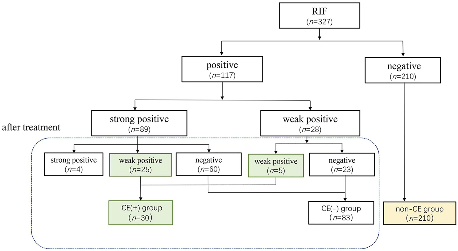 As in the Figure 1, RIF patients with CE received treatment, according to the treatment outcome by antibiotic and PRP, patients with strong and weak positive CE were classified as CE (+) group, patients with non-CE were classified as CE (−) group. RIF Patients without CE were non-CE grup.