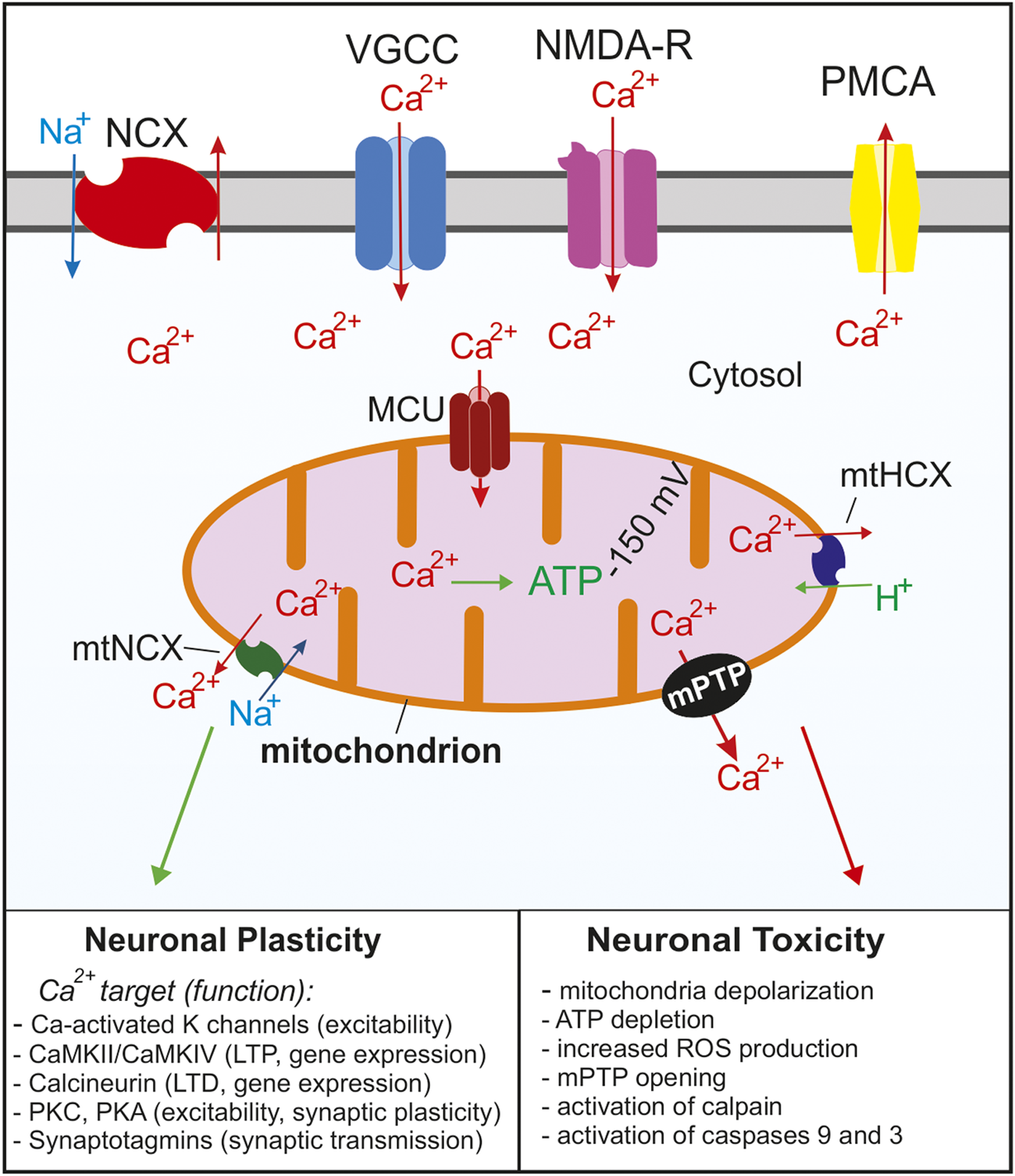 Summary of the Ca2+ signaling mechanisms in neurons that regulate cytosolic and mitochondrial Ca2+ concentrations. Ca2+ enters the cell through voltage gated Ca2+ channels (VGCC) following depolarization or through glutamate NMDA receptors. As the cytosolic Ca2+ concentration increases, the MCU complex opens and Ca2+ enters the mitochondria. Ca2+ is rapidly removed from the cytosol via Na+/Ca2+ exchangers (NCX) and plasma membrane Ca2+ ATPases (PMCA). As the cytosolic Ca2+ concentration decreases Ca2+ is slowly released from the mitochondria through Na+/Ca2+ (mtNCX) exchangers and H+/Ca2+ exchangers (mtHCX). Proper Ca2+ buffering is critical for normal neuronal functions and neuronal plasticity. Impaired buffering and Ca2+ overload leads to the opening of the mPTP and activation of apoptotic pathways and is implicated in many neurological diseases. For simplicity, the ER and other Ca2+ organelles are omitted from the model.