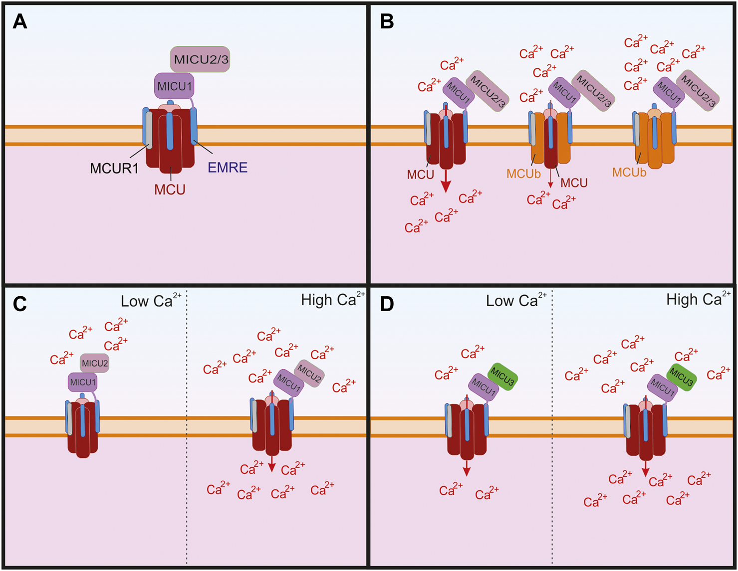 The structure of the greater mitochondrial Ca2+ uniporter (MCU) complex and its subunits that can regulate its permeability. (A) The assembled complex containing a tetramer of pore forming MCU and four subunits of the essential MCU regulator (EMRE), which are critical for the proper assembly of the transmembrane MCU to the mitochondrial Ca2+ uptake isoforms 1, 2, and 3 (MICU 1–3). The MCU complex also contains the MCU regulator 1 (MCUR1), which is thought to bind to EMRE. (B) The MCU paralog MCUb has been shown to replace subunits of pore forming MCU, which leads to reduced Ca2+ through the channel and as more MCUb subunits replace MCU the Ca2+ conductivity is reduced. (C) MICU1 and MICU two are critical for the Ca2+ sensing function of the channel and MICU2 has been shown to regulate Ca2+ sensitivity. When Ca2+ is low, MICU1 blocks the pore, but in the presence of high Ca2+ the conformational changes in MICU1 and MICU2 result in opening of the channel and allow Ca2+ to enter the mitochondria. (D) In neurons, MICU3 is more abundant and has been shown to replace MICU2 in dimers with MICU1. This replacement leads to increeased sensitivity to cytosolic Ca2+ of the MCU complex and results in MCU channel opening to lower concentrations of Ca2+ than compared to MICU2.