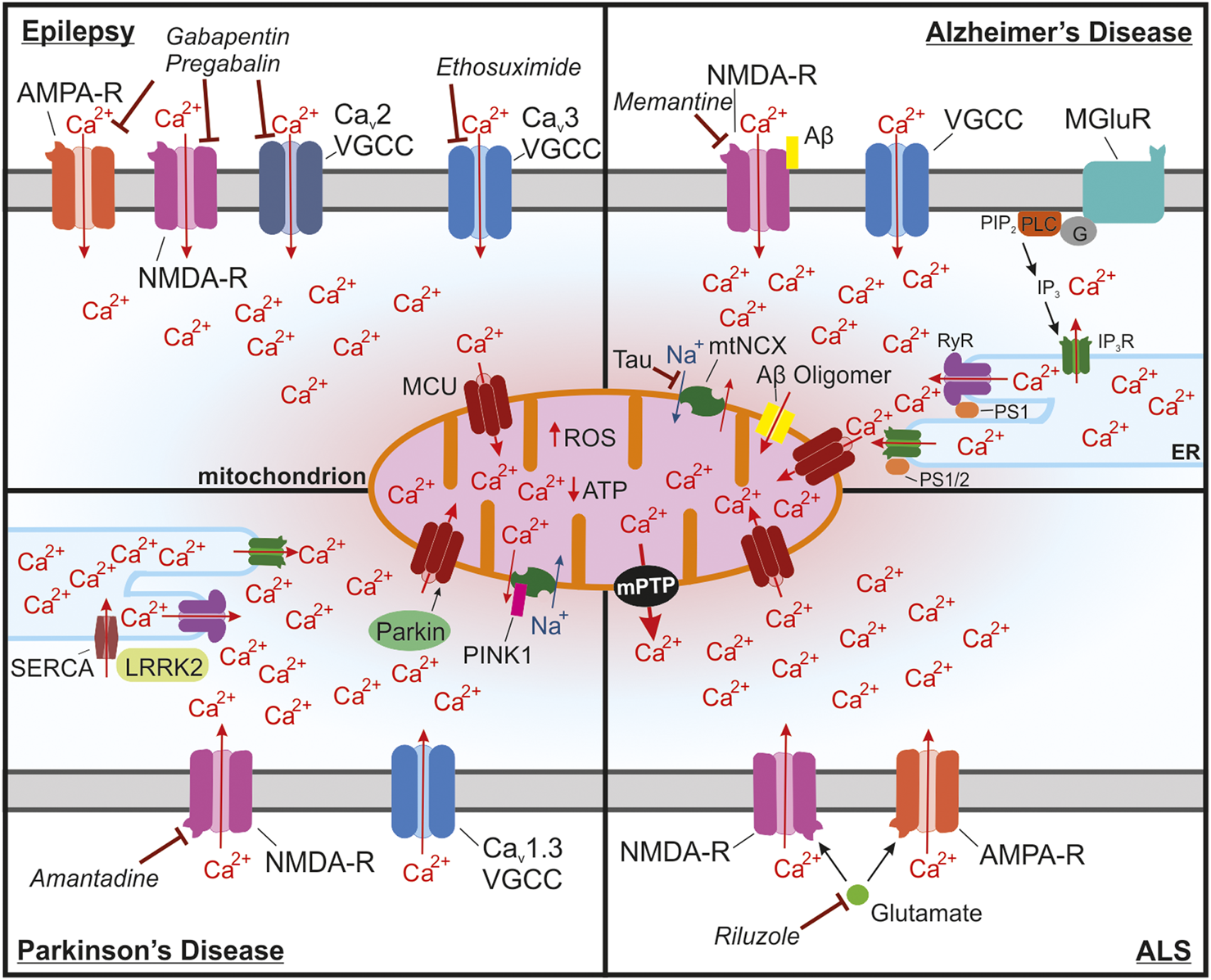 Mitochondrial Ca2+ overload leading to activation of the mPTP is a common pathway in many neurological diseases. (A) In epilepsy, seizures lead to buildup of cytosolic and mitochondrial Ca2+ through NMDA receptors, Ca2+ permeable AMPA receptors and Cav2 and Cav3 voltage-gated Ca2+ channels (VGCCs) in neurons that are in a state of hyperexcitability. Long seizures or repeated seizures can lead to Ca2+ overload in the mitochondria and trigger activation of the mPTP, ultimately leading to neuronal toxicity. Commonly prescribed antiepileptic drugs target these channels including: ethosuximide, which is a Cav3 VGCC inhibitor, as well as gabapentin and pregabalin, which act by binding to the with α2δ-1 subunit of voltage-gated Ca2+ channels, which could disrupt plasma membrane expression and function of Cav2 VGCCs, NMDA receptors, and Ca2+ permeable AMPA receptors. (B) In Alzheimer’s disease, Ca2+ overload in the mitochondria occurs through multiple mechanisms. Ca2+ entry into the cytosol can be enhanced by binding of Aβ to NMDA receptors. Internal release of Ca2+ from the ER through activation of metabotropic glutamate receptors (mGluR) also increases the accumulation of Ca2+ into the mitochondria. Enhanced Ca2+ extrusion from the ER has also been shown to occur through interactions between presenilin 1/2 (PS1/2) and inositol trisphosphate receptors (IP3R) and ryanodine receptors (RyR). This interaction seems to occur at mitochondria associated membranes (MAMs), which due to the proximity to the mitochondria, drives Ca2+ uptake into the mitochondria. Aβ oligomers also can form a pore in the mitochondria that can lead to increases in Ca2+ in the mitochondria. Ca2+ extrusion through the mitochondrial Na+/Ca2+ exchanger (mtNCX) has been shown to be impaired by tau accumulation leading to excessive Ca2+ accumulation in the mitochondria. Memantine, one of the FDA approved drugs for AD, inhibits NMDA receptors, which could block excessive Ca2+ uptake and to reduce glutamate induced excitotoxicity. (C) In Parkinson’s disease (PD), substantia nigra dopaminergic neurons are at risk of Ca2+ overload due to the presence of voltage-gated Cav1.3 channels, which are critical for the pacemaking activity of these neurons. One common form of autosomal recessive familial PD occurs through mutations in PARK2, the gene for Parkin. Parkin is responsible for regulating mitochondrial Ca2+ uptake isoform 1 (MICU1) degradation and may lead to disrupted MCU assembly altering mitochondrial Ca2+ uptake. Another form of autosomal recessive PD is caused by mutations in PINK1, which can impair mtNCX function and increase Ca2+ accumulation into the mitochondria. In astrocytes, ER Ca2+ release at MAMs may be enhanced in PD due to mutations in leucine-rich repeat kinase 2 (LRRK2), which enhance Ca2+ uptake into the ER through activation of sarcoplasmic reticulum Ca2+ -ATPase (SERCA). The NMDA receptor antagonist amantadine is used to prevent dyskinesia in PD patients. (D) In amyotrophic lateral sclerosis (ALS), motor neurons of the spinal cord and brain begin to degenerate. These neurons have been shown to have increased Ca2+ uptake through glutamate NMDA and Ca2+ permeable AMPA receptors, which enhances their susceptibility to mitochondrial Ca2+ overload. Excitotoxic glutamate, which signals through NMDA and GluA2-lacking Ca2+ permeable AMPA receptors, is the target of Riluzole, one of the few FDA approved drugs for ALS.