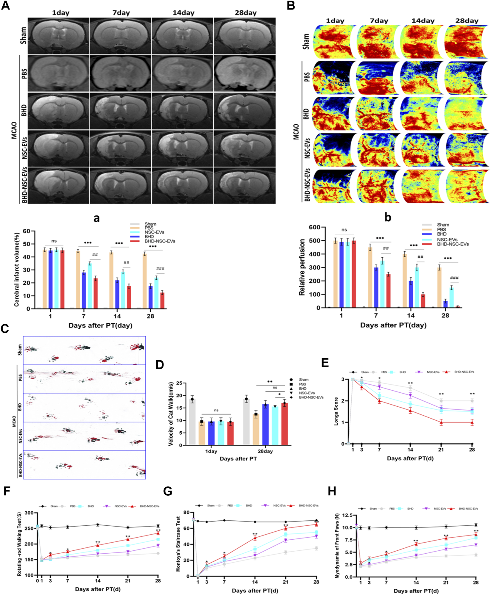 The therapeutic effect of BHD-NSC-EVs on the acquired neurological impairment after ischemic stroke. (A-a) T2-weighted images (T2WI) of MRI revealed the changed infarct volume of brain ischemia rats after MCAO and treatment at different test period, the ischemic lesion shown in white using ImageJ in BHD-NSC-EVs group reduced more obvious than that in other groups. (n = 7/group), ns: no significance. ##p < 0.01, ###p < 0.001, ***p < 0.001. (B-b) Representative images of Laser speckle of cerebral blood flow showed the changed cerebral vascular perfusion after MCAO and treatment at different test period. BHD-NSC-EVs significantly promoted cerebral vascular perfusion recovery relative to other treatments. n = 7 rats/group, ns: no significant. (n = 7/group), ns: no significance. ##p < 0.01, ###p < 0.001, ***p < 0.001. (C,D) Gait analysis after MCAO and treatment or not. (C)Representative footprints of rats walking 28 days, blue and red represent front paw and hindpaw prints, respectively, drag marks indicated lack of walking coordination. (D) velocity of cat walk test revealed significantly faster gait recovery after treatment of BHD-NSC-EVs than others. (n = 7/group), ns: no significant. *p < 0.05, **p < 0.01.(E) Longa score was assessed to evaluate neurological deficits after MCAO and treatment or not. (n = 7) *p < 0.05, **p < 0.01 BHD-NSC-EVs vs. PBS (F) Rotating-rod walking test evaluated fatigue resistance of motor function after MCAO and treatment or not. (n = 7/group), *p < 0.05, **p < 0.01 BHD-NSC-EVs group vs. PBS group (G,H) Front paws myodynamia of rats after MCAO and treatment or not were detected by montoya’s staircase test and myodynamia of frontpaws, BHD-NSC-EVs markedly strengthened the myodynamia of front paws after MCAO relative to other treatments. (n = 7/group), *p < 0.05, **p < 0.01 BHD-NSC-EVs group vs. PBS group. All data are from three independent experiments and are presented as mean ± s.e.m, two-sided Student’s t-tests were used for comparisons ,(a,b,D-H).