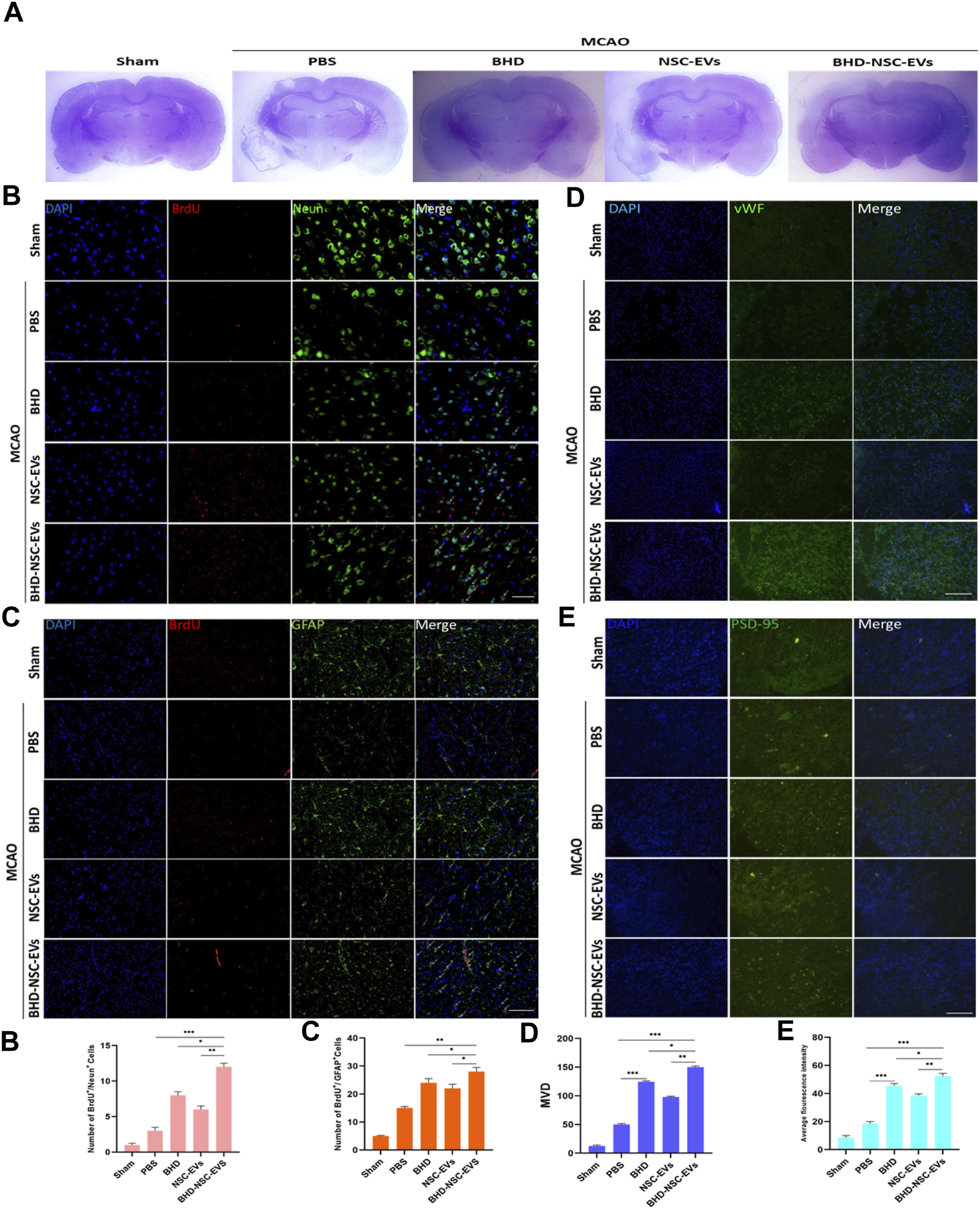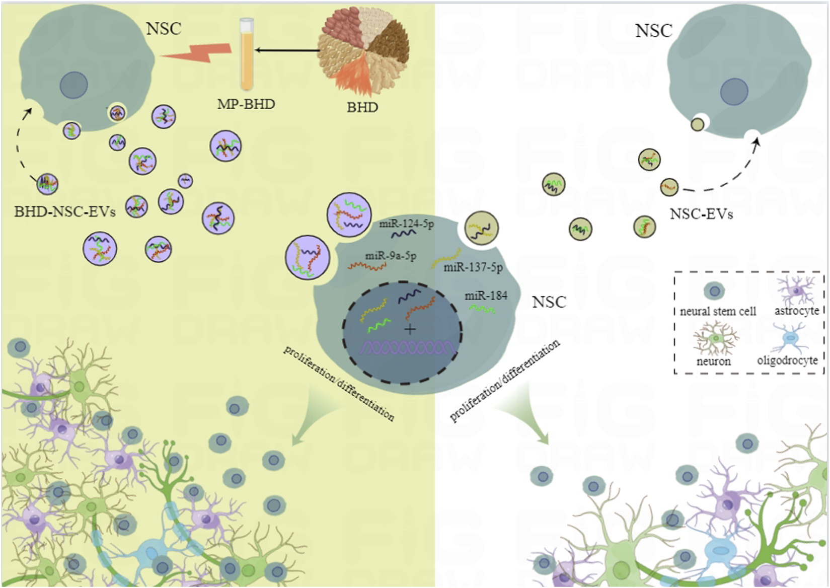 Results: The BHD-NSC-EVs more significantly accelerated neurological recovery after MCAO and promoted NSCs proliferation and differentiation than BHD and NSC-EVs alone. MP-BHD enhanced the largescale generation of BHD-NSC-EVs, which encapsulated functional miRNA and may play critical roles in neurogenesis.