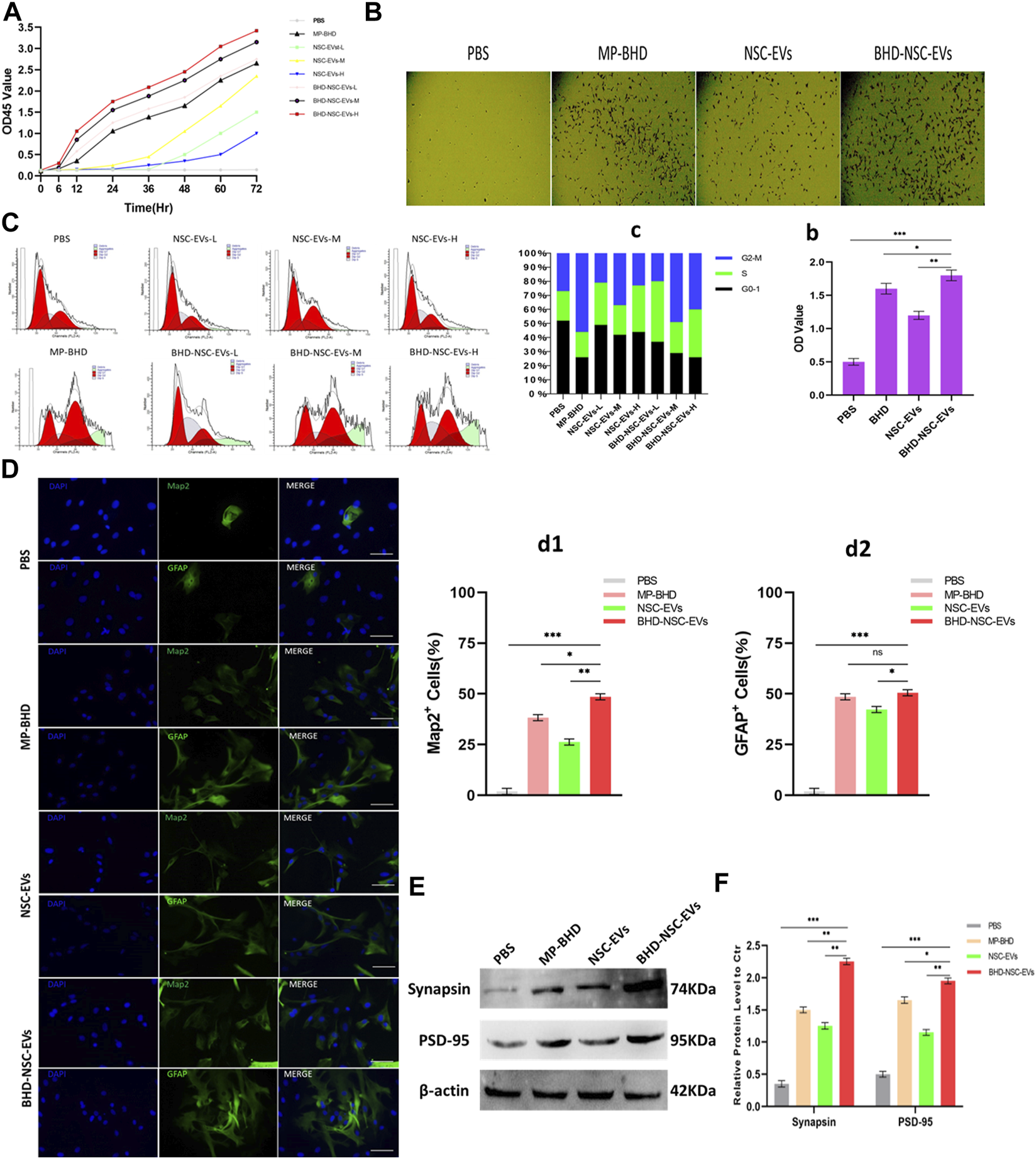 The treated neurospheres of each group were made into single cell suspension of NSCs and planted in a 96-well plate at a density of 2 × 104/well. Then the cells were treated with EVs from different groups or MP-BHD or PBS. The NSCs were co-cultured with 15 μg/mL EVs in culture medium, which was set as medium-dose group (NSC-EVs-M or BHD-NSC-EVs-M), the low-dose group (NSC-EVs-L or BHD-NSC-EVs-L) and high-dose group (NSC-EVs-H or BHD-NSC-EVs-H) with 7.5 and 30 μg/mL EVs respectively. The final concentration of MP-BHD in medium is 10% of the reaction system which was set as MP-BHD group, the PBS group contains the same volume of sterile PBS. The culture medium was added in a circle around the 96-well plate and 100 μL medium of the corresponding group was added to each well according to the experimental sequence for 48 h, following 10 μL CCK-8 solution with 10% concentration, which was added to each well and incubated at 37°C for 6 h. The OD value was measured at 450 nm with a full-wavelength microplate reader. Each group of cells was set up with three re-wells, and each experiment was repeated three times. The OD value is directly proportional to the number of viable cells in the culture system.