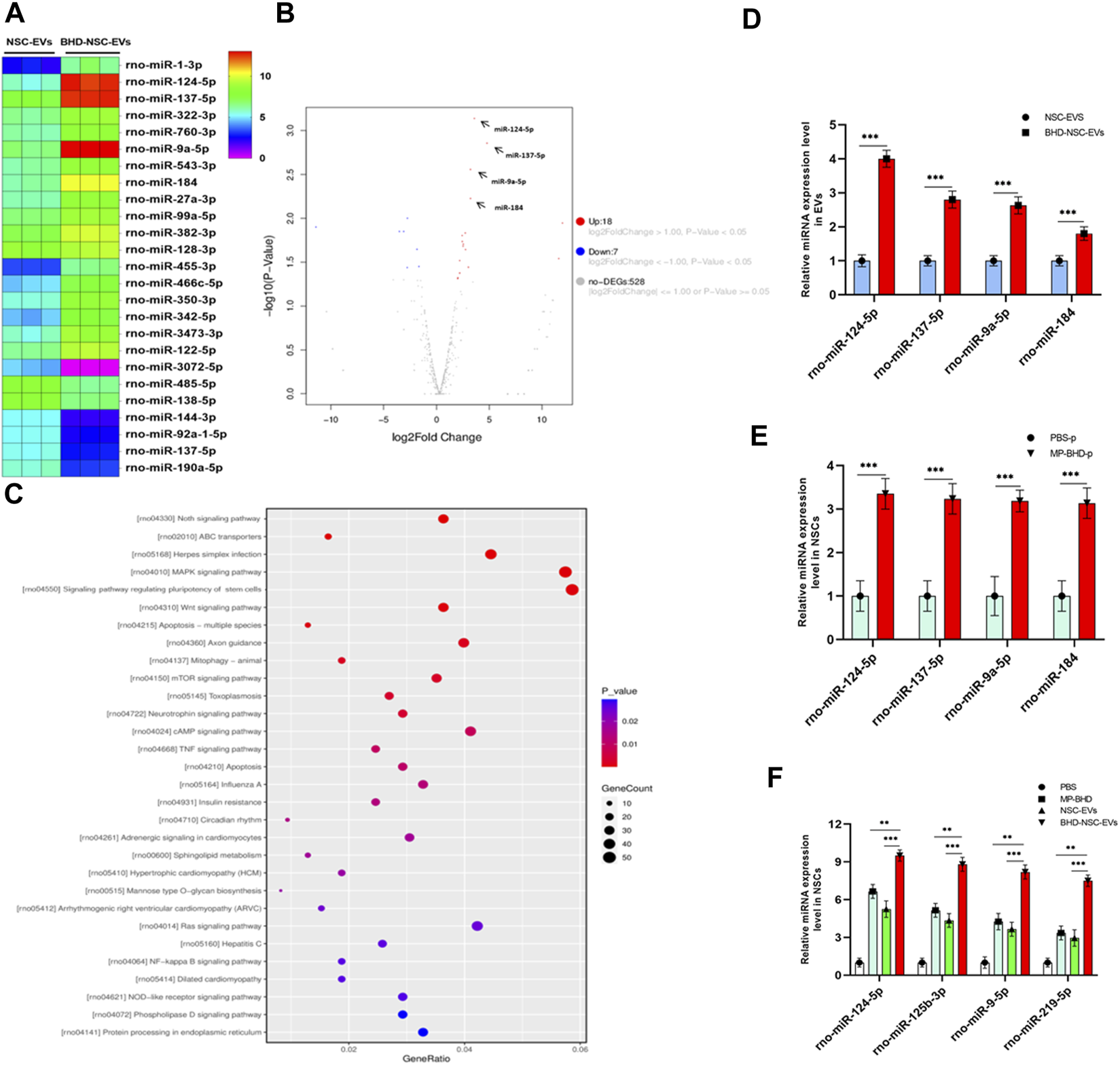 Total RNA extracted from the NSC-EVs and BHD-NSC-EVs was used for miRNA arrays. miRNA profiles were performed with OE Biotech’s (Shanghai, China) miRNA microarray service based on Affymetrix miRNA 3.0 Array. The raw fasted data quality was checked by the FASTQC, meanwhile, the adaptor was removed to trim quality bases by the Trimmomatic. The leading and trailing ambiguous or low-quality bases, which were below Phred quality scores of 3, were also removed after adapter clipping. The miRNA read counting was detected by the Chimirra and the miRNA expressions were normalized by the trimmed mean of M-values (TMM). The edge program was further used to identify the differentially expressed genes. The gene with a fold change of expression more than 2 was defined as a differentially expressed one. The miRNA target gene prediction was detected through TargetScan (http://targetscan.org/) and miRDB (http://www.mirdb.org/). And the cluster Profiler R was also performed to conduct the Gene Ontology (GO) (http://www.geneontology.org/) and Kyoto Encyclopedia of Genes and Genomes pathway (KEGG) (http://www.genome.jp/kegg/) enrichment analyses.