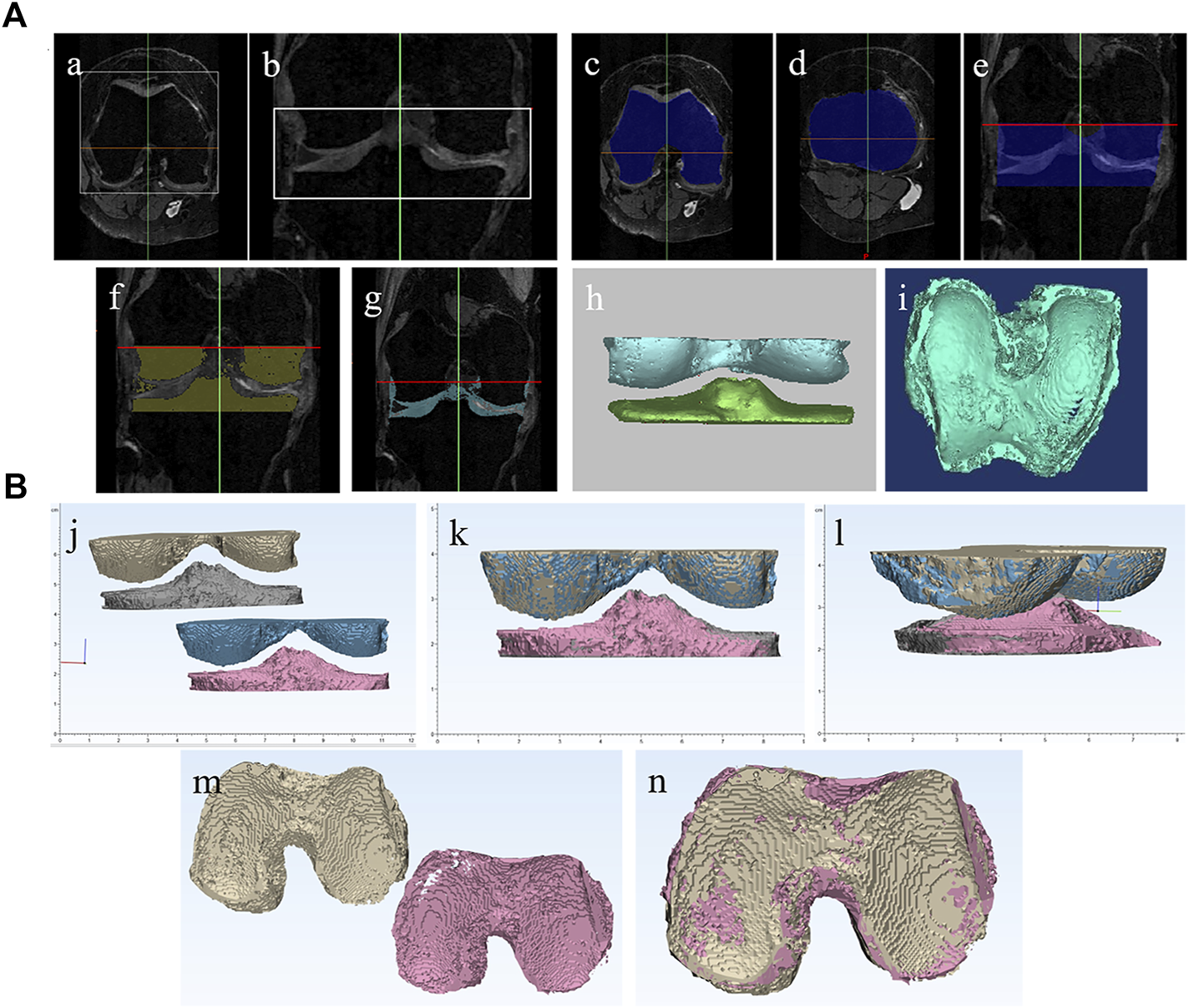 Establishment of human knee joint MRI 3D models and 3D spatial alignment method. (A) Establishment of human knee joint MRI 3D models: (a,b) The detection range from the femoral condyle to the tibial plateau of knee joint is selected in coronal plane and sagittal plane of MRI; (c–e) region growing method is used to obtain the contour curves of all planes of the detection range; (f,g) Based on the gray scale thresholds of cartilage or bone, the scanning sequences of cartilage or bone within the selected region are identified respectively. (h,i) the cartilage and bone 3D MRI models are generated. (B). Establishment of 3D spatial alignment method: (j-n) 3-matic was applied to spatially align the MRI image data I and II based on osteogenic section to ensure that the cartilage section is registered in the same 3D spatial domain.
