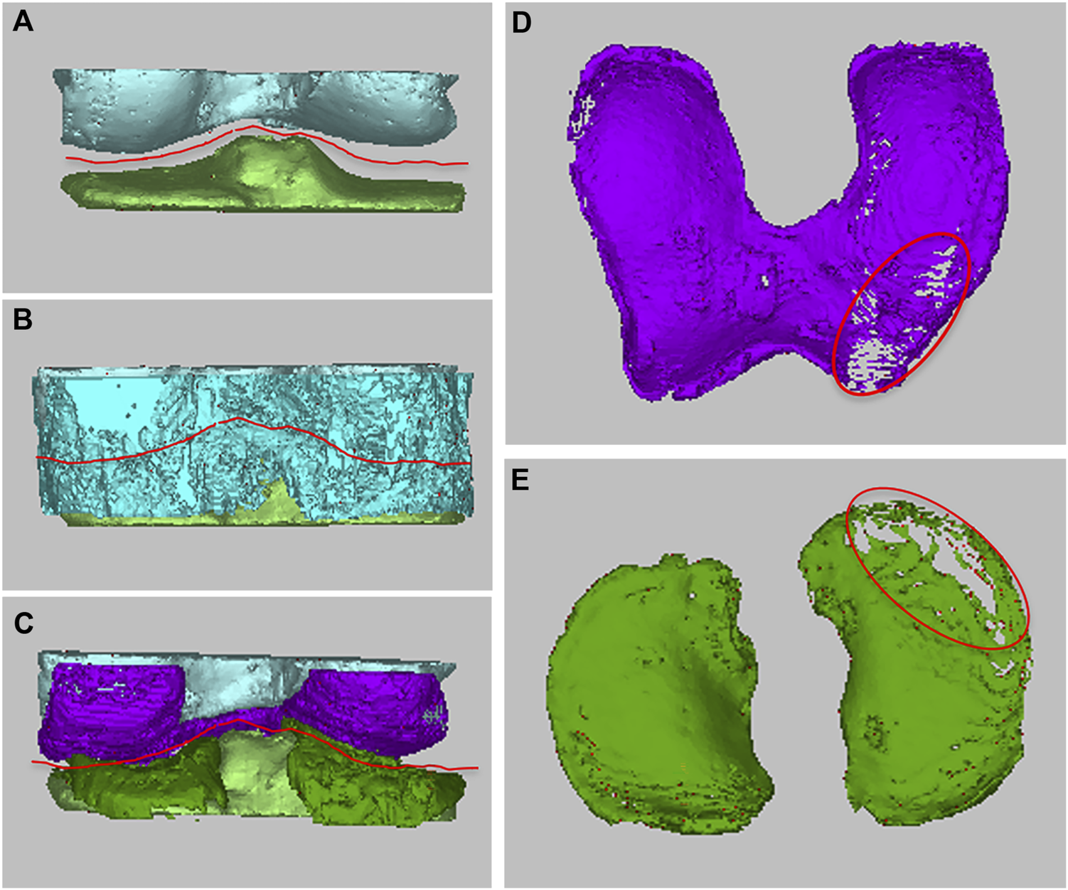 Qualitative analysis of femoral cartilage and tibial cartilage. (A–C) The articular cartilage was determined with the articular surface of femur or tibia as the reference template, (D,E) the damage of cartilage were qualitatively analyzed based on the defect of articular cartilage.