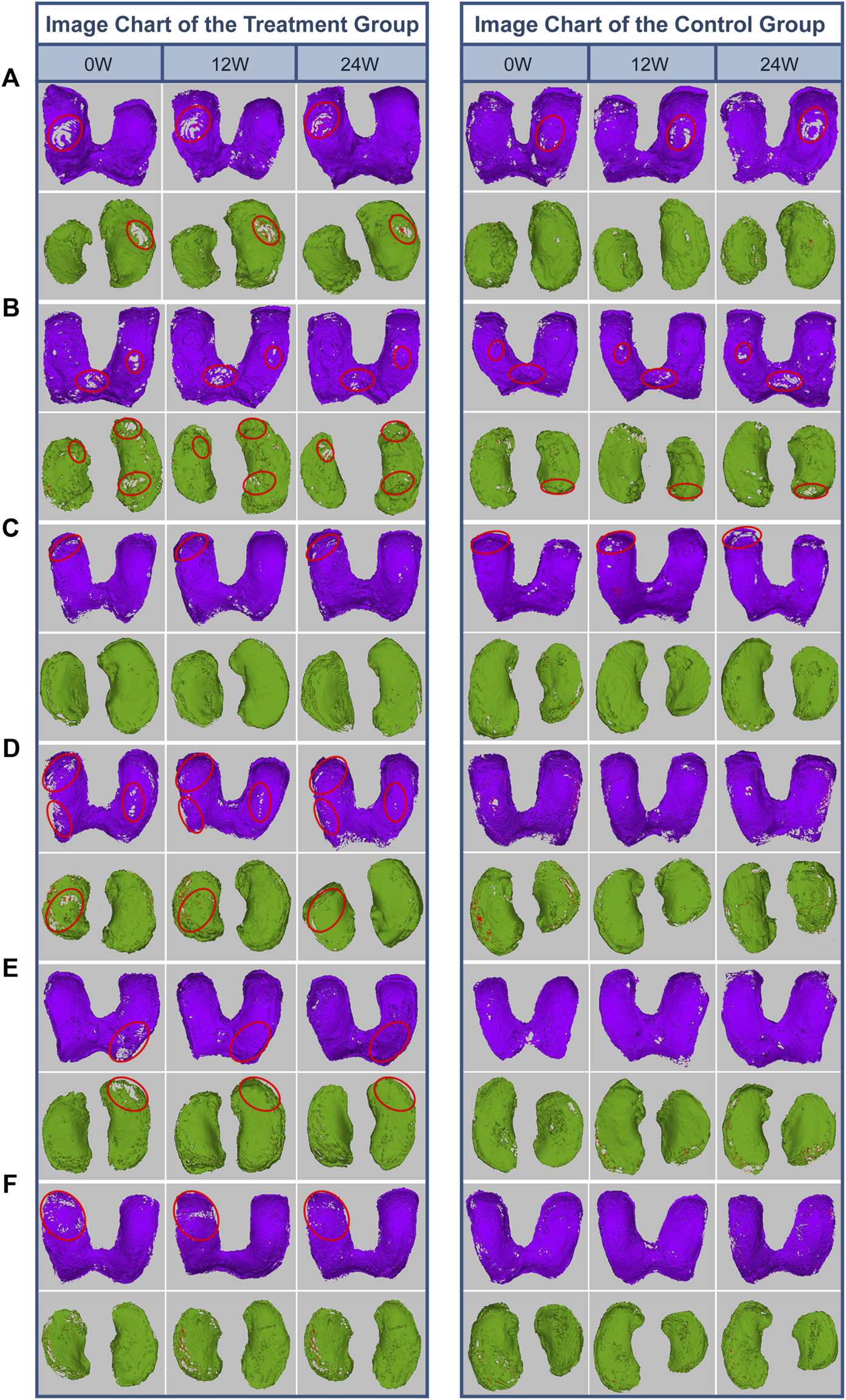Qualitative analysis of femoral cartilage and tibial cartilage defects of 6 enrolled patients. (A) Patient 1: female, 69 years, BMI = 23.5. (B) Patient 2: female, 69 years, BMI = 20. (C) Patient 3: female, 64 years, BMI = 23.8. (D) Patient 4: female, 59 years, BMI = 29.2. (E) Patient 5: female, 59 years, BMI = 27.3. (F) Patient 6: male, 53 years, BMI = 25.0. After a single injection of SVF the femur and/or tibia cartilage defects of all 6 patients show improvement, some show significant reduction at 12 and 24 weeks post therapy in comparison with pretreatment. In contrast, most the defects of untreated group show deterioration and some new defects are noted.