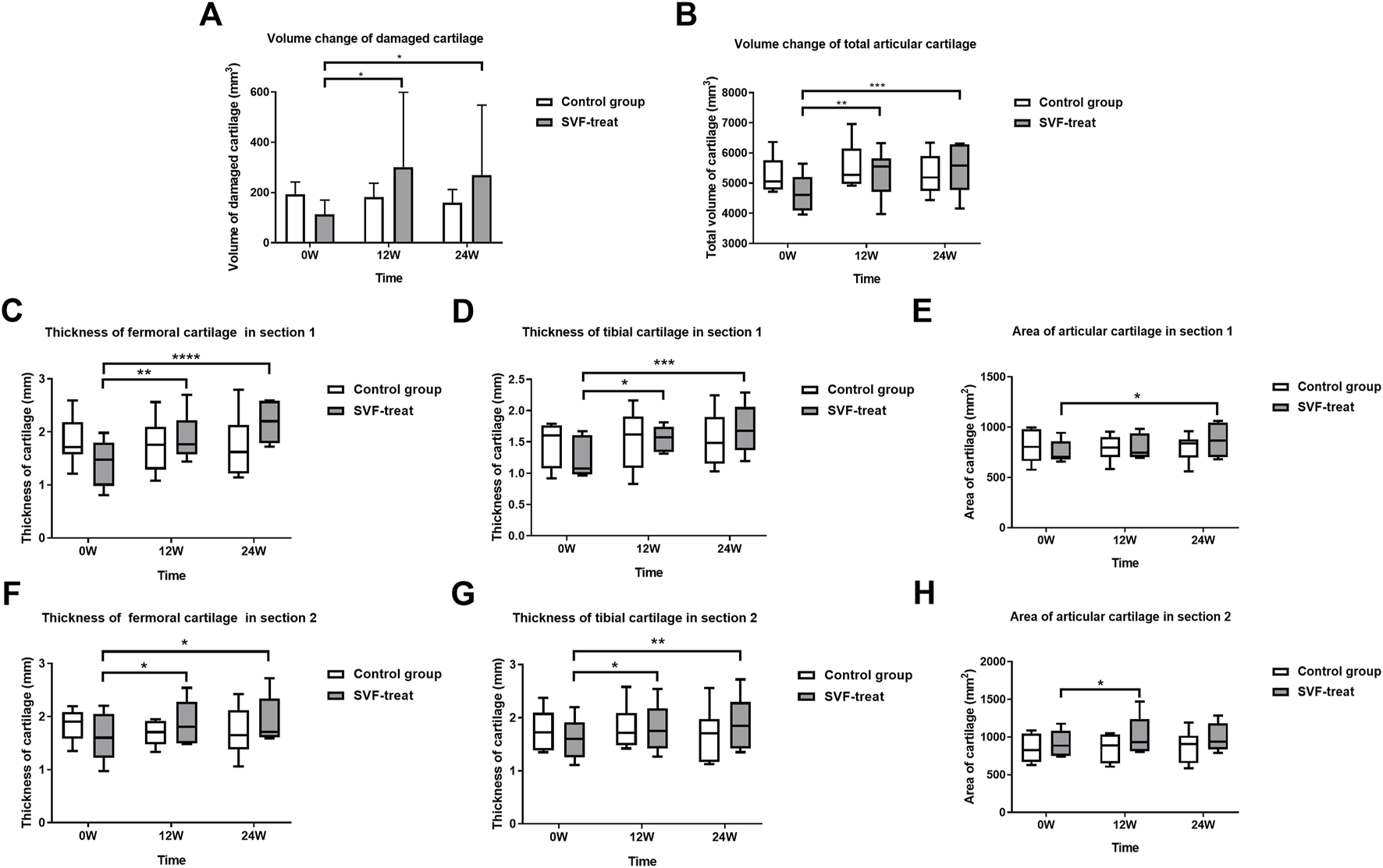 Radiologic evaluation of articular cartilage: volume, area and thickness. (A) Volume change of damaged cartilage. (B) Volume change of total articular cartilage. (C) Thickness of femoral cartilage in section 1. (D) Thickness of tibial cartilage in section 1. (E) Area of articular cartilage in section 1. (F) Thickness of femoral cartilage in section 2. (G) Thickness of tibial cartilage in section 2. (H) Area of articular cartilage in section 2. The volume of damaged cartilage and total cartilage, thickness and area of articular cartilage improved significantly in SVF treated group at 12 and 24 weeks as compared to baseline, while no significant difference was observed in control group.