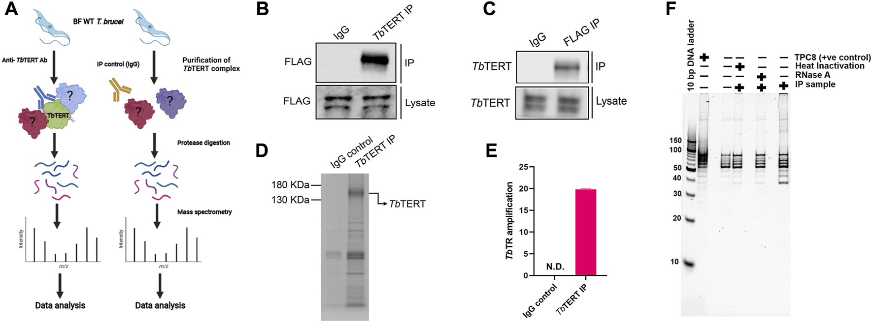 Affinity-purification mass spectrometry of bloodstream form T. brucei telomerase reverse transcriptase. (A) Experimental workflow for proteomic analysis. BF T. brucei cells expressing a FLAG tagged version of TbTERT were grown and TbTERT complexes were purified using a custom anti-TbTERT C terminus antibody. An IgG isotype antibody was used as a control. Purified TbTERT complexes were then digested with trypsin. These peptides were then analyzed by LC-MS/MS. (B) Western blot confirming the presence of immunopurified TbTERT. IP samples were obtained and run on SDS-PAGE gels and immunoblotted with anti-FLAG antibody to detect TbTERT. (C) Western blot confirming the presence of TbTERT. IP samples were obtained and run on SDS-PAGE gels and immunoblotted with an anti-TbTERT C terminus antibody to detect TbTERT. (D) SDS-PAGE analysis of immunopurified TbTERT. A small aliquot was also resolved on SDS-PAGE and stained with Coomassie stain to qualitatively check TbTERT protein levels. (E) RT-qPCR detection of TbTR from Immunopurified TbTERT complexes. (F) Telomerase activity of the bead-bound telomerase enzyme was analyzed by telomerase primer extension assay.