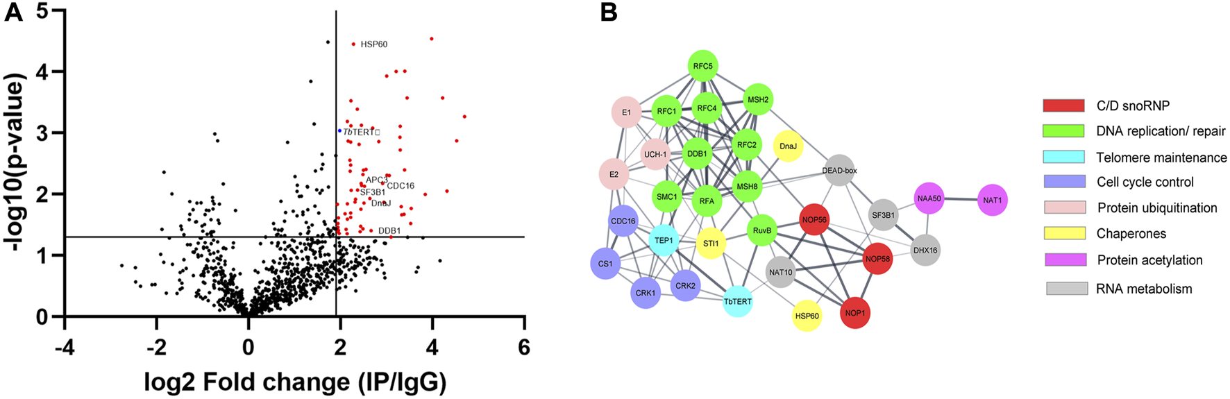 (A) Volcano plot was performed with an x-axis representing the difference in logarithmic protein intensities between the TbTERT immunoprecipitation elution and the isotype matched IgG control (Elution and Control experimental groups). The y-axis is the negative log of the two-sided Student’s t-test. The volcano plot serves as a visual representation of the protein groups that are significantly enriched between the elution and control groups. These enriched groups contain the bait protein TbTERT and several candidates interacting with a p-value ≤ 0.05. (B) Protein-protein interaction network of relevant TbTERT hits identified by MS. Network was generated using the STRING database and visualized using Cytoscape. Colors of nodes represent the protein’s biological function. The thickness of the lines denotes the strength of the interaction (confidence PPI, threshold: 0.4, medium confidence).