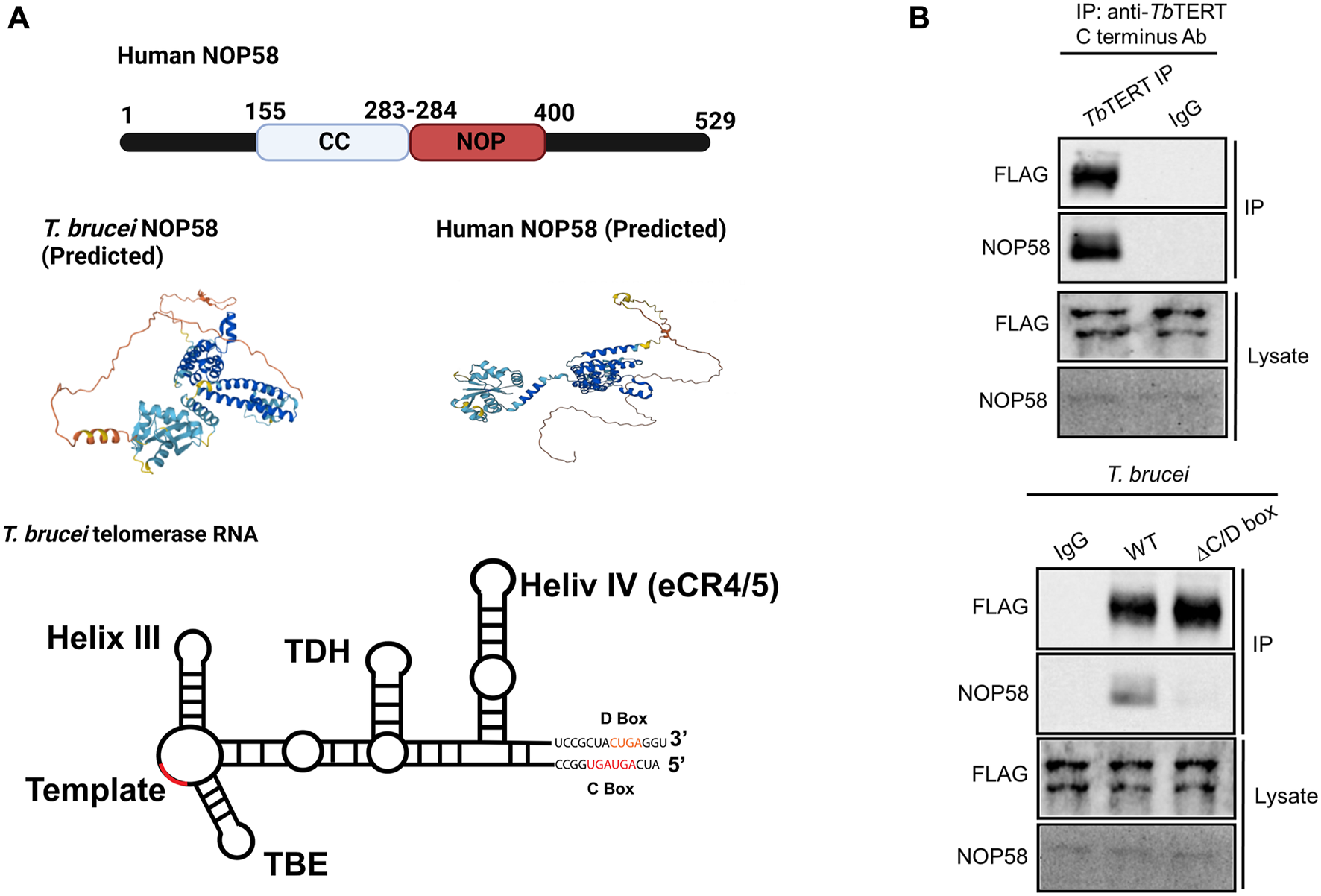 NOP58 interacts with the T. brucei telomerase complex. (A) Domain structure of human NOP58. Predicted secondary structure models for T. brucei and human NOP58 obtained from AlphaFold (Jumper et al., 2021) Predicted protein structures are shown in the same orientation. Dark blue represents a very high model confidence (pLDDT >90), light blue confident (90 > pLDDT >70), yellow low confidence (70 > pLDDT >50), orange very low confidence (pLDDT <50). Secondary structure model of T. brucei telomerase RNA. The C/D box binding motif is highlighted. [(B), top] Co-IP assay using WT T. brucei cell lysate. IP antibody: anti-TbTERT C terminus; Western blot antibodies: anti-FLAG and anti-NOP58. [(B), bottom] Co-IP using both WT and ∆C/D box mutant cells. IP antibody: anti-TbTERT C terminus; western blot antibodies: anti-FLAG and anti-NOP58.