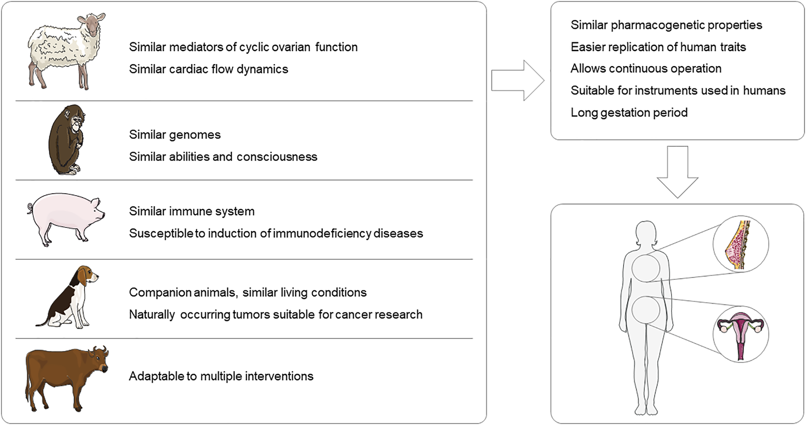 Advantages of large animal models for gynecological disease research. This figure was created using images from Servier Medical Art Commons Attribution 3.0 Unported License (http://smart.servier.com).