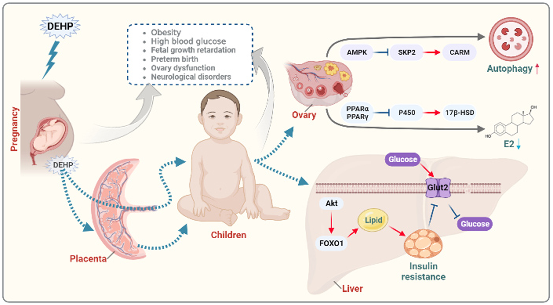 Diagram of the potential mechanisms of prenatal exposure to DEHP in offspring endocrine disorders. Functionally, DEHP could cross the placental barrier and directly or indirectly act on the fetus leading to growth retardation, preterm birth, ovary dysfunction and neurological disorders. Maternal exposure to DEHP could induce obesity and high blood glucose in offspring. Mechanically, maternal exposure to DEHP could activate AMPK-SKP2-CARM signaling to disrupt follicular development via autophagy in the offspring ovary. Moreover, DEHP can decrease P450 aromatase by activating PPARα and PPARγ, leading to the inhibition of ovarian secretion of hormones. Maternal DEHP exposure involving in regulating GLUT2 expression and in the liver leading to insulin resistance through FOXO1 signaling in immature male offspring. The figure was created with BioRender.com.