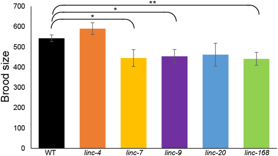 Deletion of three lincRNA genes leads to reduced male fertility. Average progeny brood sizes for females mated with males of the indicated lines. Mann-Whitney p-value: * <0.05, ** <0.01.