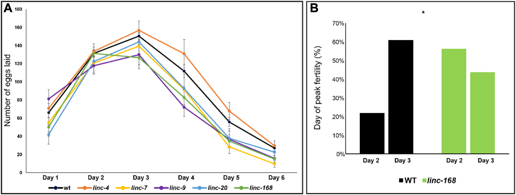 To find whether the deletion of the lincRNAs resulted in a change in the egg-laying dynamics we compared the brood size in each of the 24 h intervals over the 6 days period (Figure 4A). We found that the general dynamics of egg-laying of females mated with the lincRNA mutant males were similar to wild-type males, and most showed a peak of brood production in the third day of adulthood (Figure 4A). The only exception was linc-168 in which 56% of the mated worms reached a peak on the second day of adulthood compared to 24% of the worms mated with wild-type males (Figure 4B; p-value <0.05 by the Fisher exact test). In the three strains that demonstrated reduced fertility we found variation in the time points in which most of the reduction compared to wild type was measured. linc-9 displayed a non-significant increase in brood size the first day after mating but had significant reduction in the number of progeny compared to wild-type in days that followed (Figure 4A; p-value <0.05 by the Mann-Whitney test). Conversely, in linc-7 and linc-168, we found reduced brood size across the entire tested period, but we only found a statistically significant reduction in broods on days five and six after mating. Given that the total brood size of linc-9 is larger than linc-7 and linc-168 males, these results raise the possibility for a more substantial effect in the last days of egg laying after fertilization by linc-7 and linc-168. We conclude that the reduction in brood size of females mated by lincRNA deletion strain males occurs at different times along the fertility term depending on the removed gene.