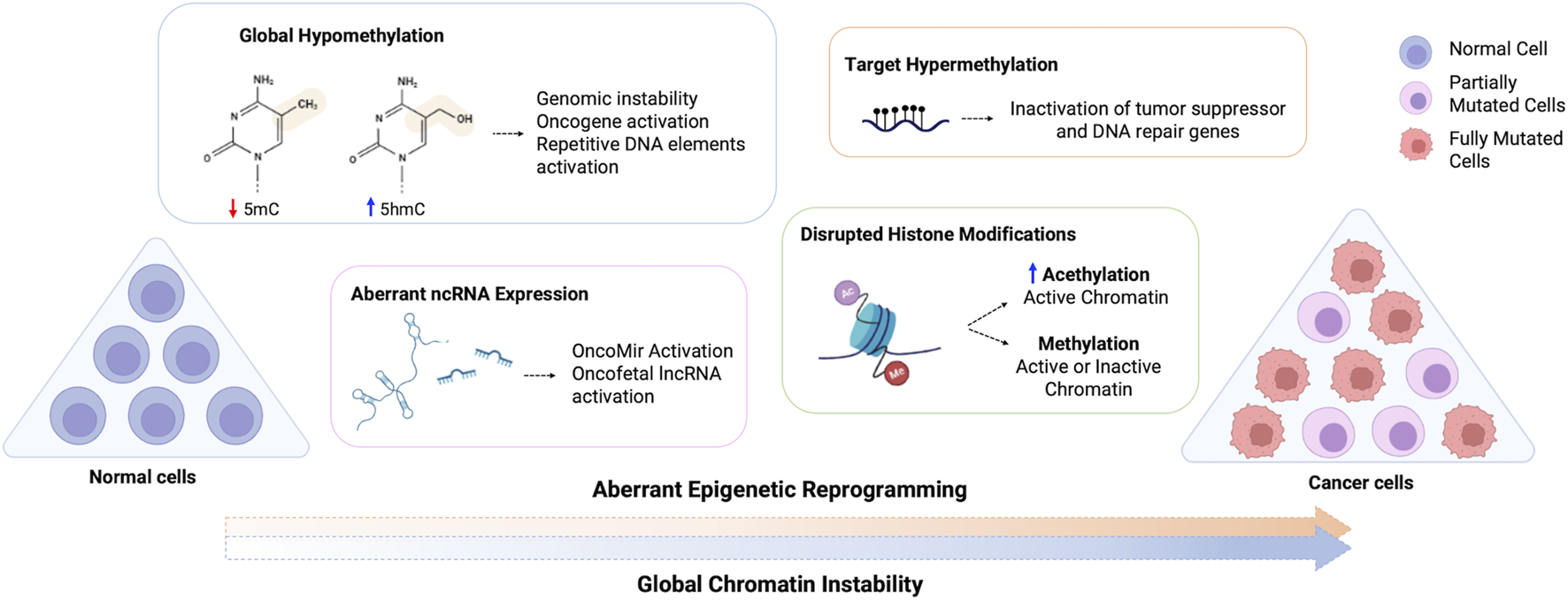 Schematic representation of the aberrant epigenetic reprogramming on cancer cells. Normal cells are aberrantly reprogramed through loss of global methylation, altered ncRNA expression, disrupted histone modifications and hypermethylation of target genes, which can inactivate tumor suppressor and DNA repair genes and activate oncogenes, resulting in the global chromatin instability observed in cancer cells. 5mC, 5-methylcytosine; 5hmC, 5-hydroxymethylcytosine.