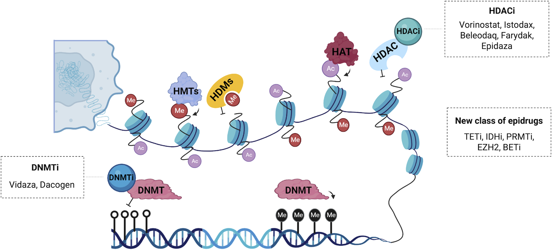 Schematic representation of the main epidrugs targets. Histone acetyltransferases (HATs) and deacetylases (HDACs) are enzymes responsible for post-translational acetylation and deacetylation, respectively. HDAC inhibitors (HDACi) such as Vorinostat®, Istodax®, Beleodaq®, Farydak® and Epidaza® induce acetylation thereby promoting transcriptional activation. Histone methyltransferases (HMTs) and demethylases (HDMs) can also be modulated by a new class of epigenetic drugs. DNA methyltransferases (DNMTs) are enzymes responsible for transferring a methyl group to carbon five of cytosine, a repressive epigenetic marker. DNMT inhibitors (DNMTi) like Vidaza® and Dacogen® promote loss of methylation and activation of aberrantly silenced genes. Other compounds with epigenetic activity are inhibitors of the enzyme ten-eleven translocation (TETi), inhibitors of the enzyme isocitrate dehydrogenase (IDHi), inhibitors of the protein arginine methyltransferase (PRMTi), inhibitors of the bromodomain and extra-terminal domain (BETi) and inhibitors of the enhancer of zeste homolog 2 (EZH2i), which is a histone-lysine n-methyltransferase enzyme.