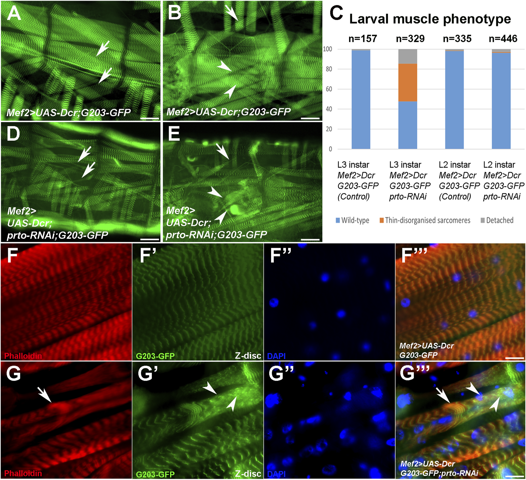 prto is required to maintain sarcomeric homeostasis. (A–F) Whole mount of L3 larvae muscle preparations expressing a GFP trapped Z-disc protein (203-GFP) in control (A,B) and Mef2>UAS-Dcr;prtoRNAi(D,E) larvae raised at 29°C and muscle phenotypic analysis of L2 and L3 somatic muscles (C). Scale bar 50 µm. Arrows denote wild-type and over-stretched muscles and arrowheads wild-type and muscle detachments. Note in (C) ∼ 50% somatic muscles are thinned or truncated in prto deficient muscles in comparison to control. No phenotypic differences are observed in L2 instar. (F–F‴) Sarcomeric architecture of L3 control somatic muscle displaying actin filaments (phalloidin; (F)), Z-disks (203-GFP; (F′)), nuclei (DAPI; (F′′)) and merge (F‴). Scale bar 20 µm. (G–G‴) Sarcomeric structure in Mef2>UAS-Dcr;prto-RNAi L3 muscles show a loss of the repeated sarcomeres with clumps of actin filaments ((G), arrow), clusters of sarcomeric proteins distributed in the sarcolemma ((G′), arrowheads) and nuclei being abnormal in shape and non-evenly distributed along the muscle (G′′) and merge (G‴). Scale bar 20 µm.