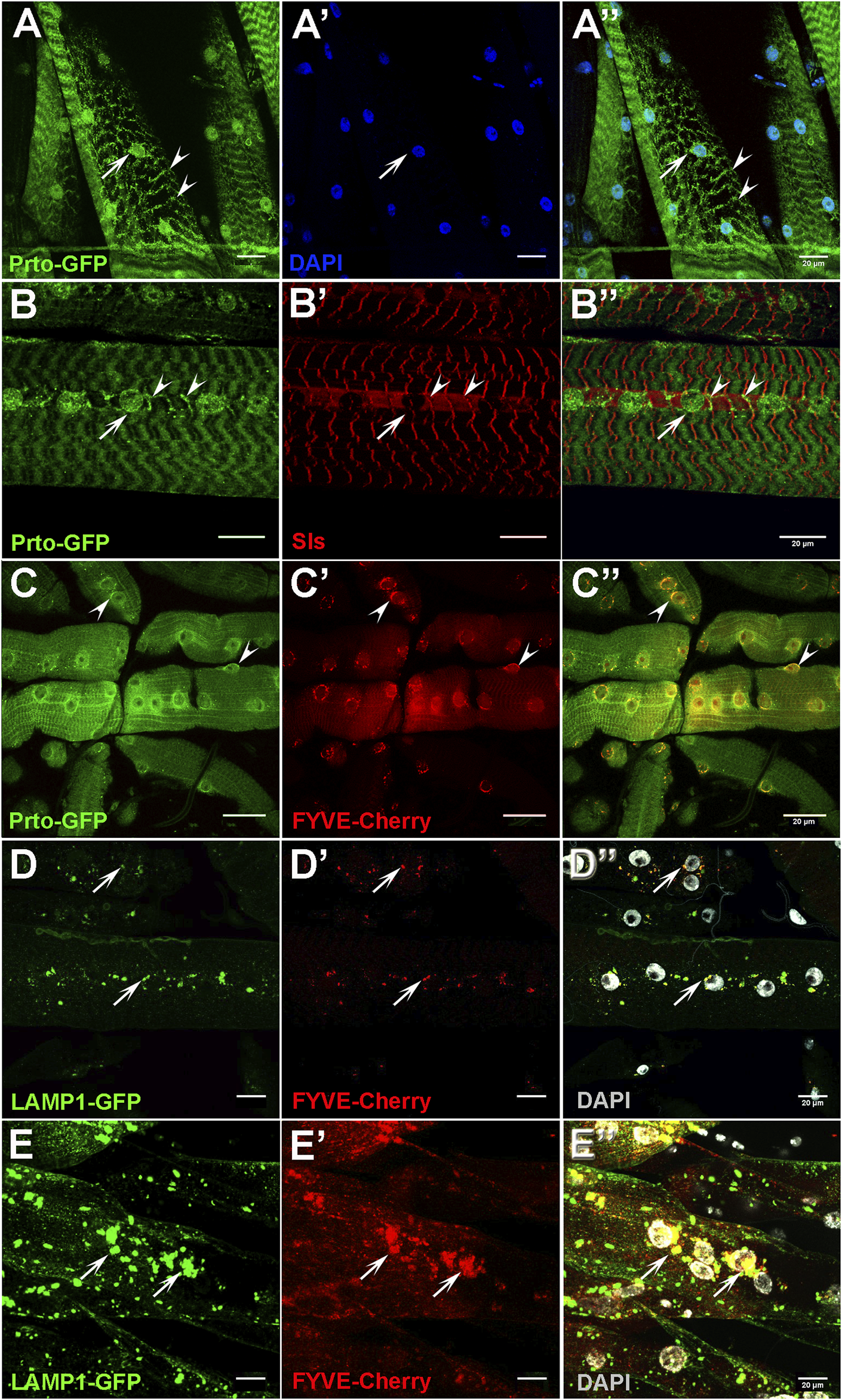 To understand the mechanisms by which Prto membrane peptides regulate the maintenance of sarcomeric structures we explored important cellular processes such as endosome and lysosome distribution. Firstly, in control muscles, the endosomes (FYVE-Cherry) and lysosomes (LAMP1-GFP) are distributed across the sarcolemma and enriched in the perinuclear region, overlapping abundantly in endo-lysosomal compartments (arrows; Figures 4D–D″). In UAS-Dcr;prto-RNAi KD muscles, these compartments are enlarged and accumulated around the aberrant nuclei, even when muscles are not showing major structural defects (arrows; Figures 4E–E″). Thus, it seems that disrupting prto function negatively affects endosome and lysosome functions and therefore compromises sarcomeric integrity leading to loss of muscle function.