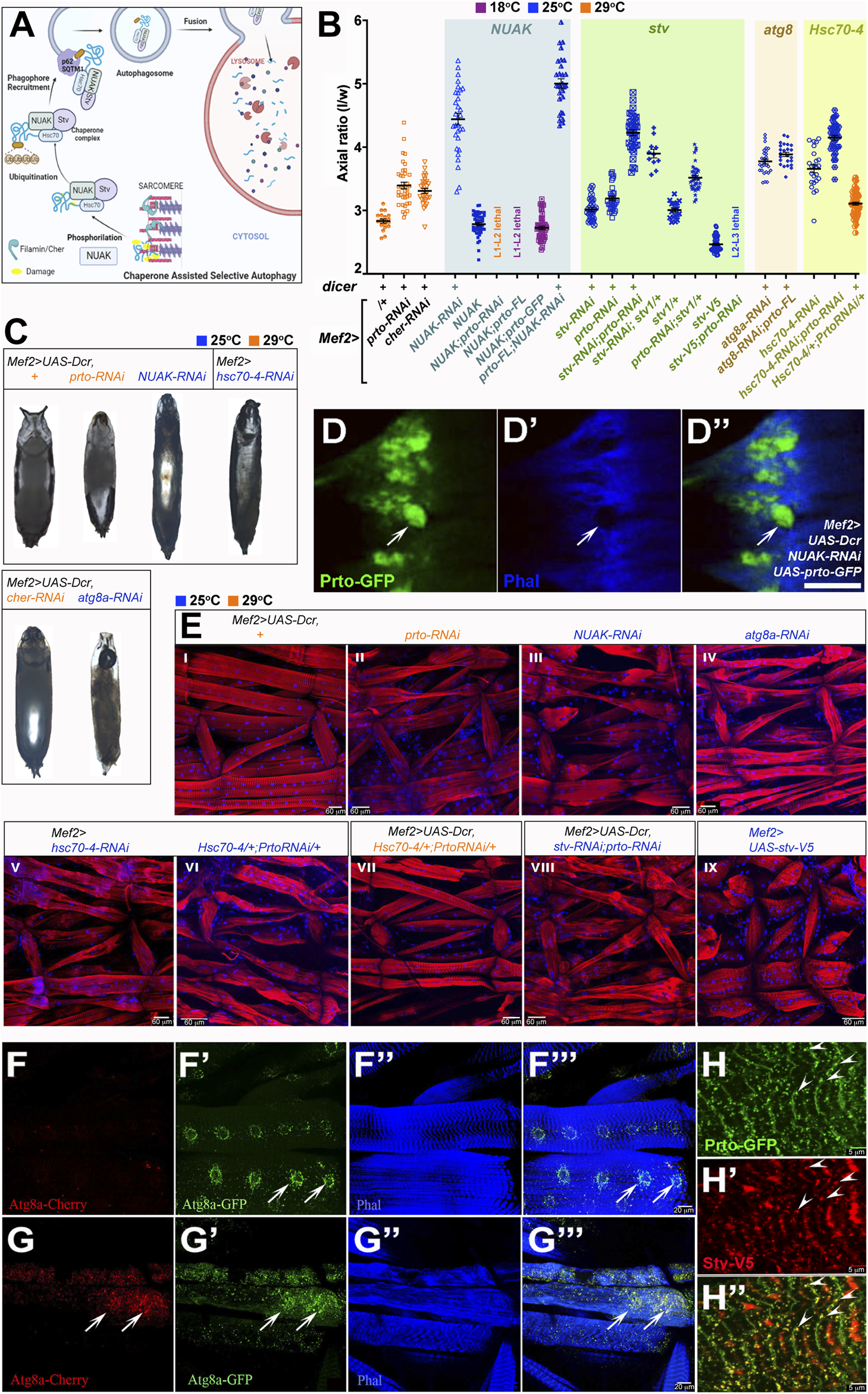 prto interacts genetically with CASA pathway for maintaining sarcomeric integrity. (A) Model for Chaperone Assisted Selective Autophagy (CASA) of Filamin/Cher in muscles constructed using Biorender.com. Filamin dimers maintain muscle sarcomeric structure undergoing sustained contractile forces during locomotion. Damaged Filamins (yellow) are phosphorylated by NUAK kinases and recruits Stv-Hsc70-4 protein complex for refolding. Unrepairably damaged Filamins are ubiquitinated and subsequently recruited by the p62/SQSTM1 complex and Atg8a to initiate autophagosome formation. Autophagosomes fuse with lysosomes for degradation of damage Filamin/CASA complexes. (B) Axial ratio measurements of prto and CASA RNAi KD genotypes and genetic interactions. Genotypes denoted in the x-axis and grouped by gene interaction each with a distinct background colour. All + and RNAi genotypes are driven with Mef2> without or with Dicer the latter denoted as (+) above genotypes. Temperature conditions for each genotype are shown as different colours (18°C: purple; 25°C: blue; 29°C: orange). 1way ANOVA with Bonferroni’s Multiple Comparison test. was utilised (see Supplementary Table S2). n = 11–63, error bars represent 95% CI. (C) Pupae morphology of following genotypes: Mef2>UAS-Dcr control, Mef2>UAS-Dcr driven: prto-RNAi, NUAK-RNAi, cher-RNAi, atg8a-RNAi, and Mef2>hsc-70-4-RNAi. Scale Bar is 1 mm. (D–D′′) Confocal image Mef2>UAS-Dcr;NUAK-RNAi muscle showing the expression of Prto-GFP (D) and actin filaments (Phalloidin) (D′). Note that large aggregates of Prto-GFP are formed in actin-depleted regions in the sarcomeres (arrow). Merged image (D′′). Scale bar 5 µm. (E) Sarcomeric structure and nuclei revealed by phalloidin (red) and DAPI (blue) staining respectively in L3 somatic muscles of stated genotypes. Scale bar 60 µm. (F–F‴) Autophagosome distribution revealed by expression of Atg8a-GFP-Cherry in L3 muscles shows increase of staining surrounding the nuclei (arrows). Autophagosomes expressing Atg8a-Cherry (F). Expression of Agt8a-GFP only in neutral pH autophagosomes (not fused to lysosomes; (F′)). Actin filaments (phalloidin; (F′′)). Merged image (F‴). (G–G‴)Mef2>UAS-Dcr;prto-RNAi L3 somatic muscle stained as (F–F‴). Note a striking increase of autophagosomes is observed in the sarcolemma (arrows; compare with (F). (H–H′) Image depicting Prto-GFP peptides ((H); green), and V5-tagged-Stv protein ((H′); red) showing colocalization (arrowheads) in punctae along Z-disks ((H′); yellow). Scale bar 5 µm.