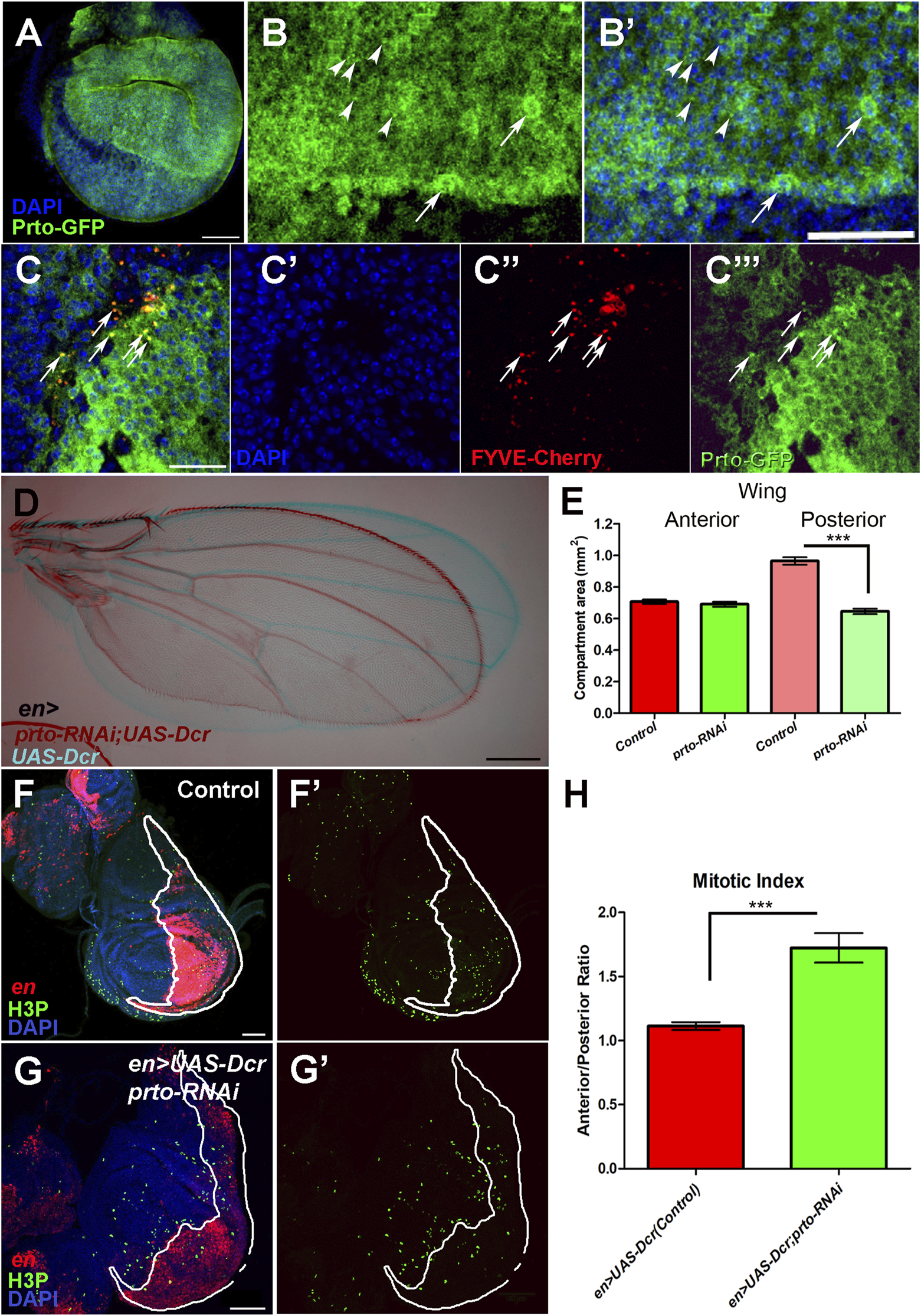 prto is required for proper growth of the Drosophila wing. (A) Prto-GFP expression in L3 imaginal disc using the Dlmo-Gal4 driver shows that Prto peptides are localised in the plasma membrane. Scale bar 60 µm. (B–B′) Higher magnification of (A), showing Prto-GFP peptides (B–B′) in the plasma membrane of epithelial cells and in intracellular puncta (arrowheads) and nuclei (DAPI, (B′)). Scale bar 40 µm. (C–C‴) Colocalization of Prto-GFP and FYVE-Cherry is observed in wing imaginal disc (arrows). Merged image (C) showing nuclei (DAPI; (C′)), endosomal marker (FYVE-Cherry (C′′)) and Prto-GFP (C‴). Scale bar 20 µm. (D) Overlay of a control (en>UAS-Dcr/+; blue) and en>UAS-Dcr;prto-RNAi (maroon) adult wing showing a reduction of posterior region. Scale bar 200 µm. (E) Measurement of the anterior and posterior compartments of control and prto KD wings showing that the posterior compartment is reduced in prto KDs. Two-tailed Mann Whitney test was performed. n = 12, error bars represent 95% CI, *** = p< 0.0001. No significance p > 0.05 was observed in anterior compartment. ((F–F)′ Distribution of Histone 3 phosphorylation (green) in control en>UAS-dsRed wing imaginal discs and posterior compartment labelled in red. (G–G′)en>UAS-dsRed;prto-RNAi wing imaginal disc labelled as in (F). Scale bar 50 µm. (H) Mitotic index ratio is the number of positive H3P cells anterior compartment divided by the number positive H3P in posterior compartment (white outlined red staining). Control wing imaginal discs is around 1. However, the mitotic index ratio in en>UAS-dsRed;prto-RNAi is higher due to a lower number of cells in posterior compartment undergoing mitosis. Two-tailed Mann Whitney test was applied. n = 13, error bars represent 95% CI, *** = p< 0.0001.