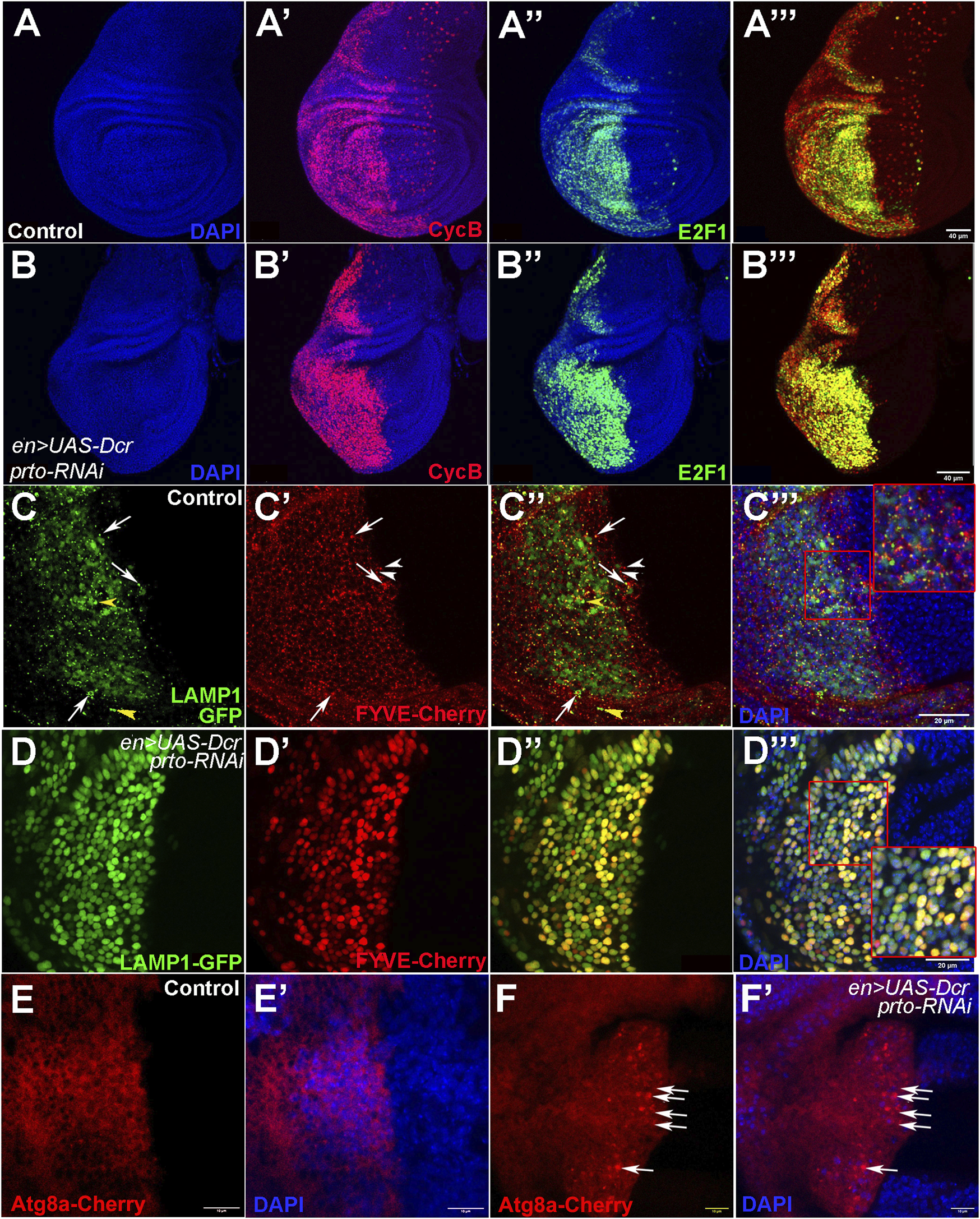 Next, we monitored the distribution of endosomes and lysosomes (Prto-positive intracellular compartments) in the wing disc epithelium by using FYVE and LAMP-1 markers respectively. Both the FYVE and LAMP-1 markers are distributed in cytoplasmic punta in en>UAS-Dcr control wing imaginal discs (Figures 7C–C‴). However, in en>UAS-Dcr; prto-RNAi KD wing discs, larger aggregates of FYVE and LAMP-1 were observed throughout the cell (Figures 7D–D‴). Interestingly, an increase of Atg8a-positive autophagosomes was also observed in prto-RNAi KD wing discs in comparison to controls (Figures 7E–E′, F–F′). Thus, these results suggest that prto depletion disrupts endo-lysosomal homeostasis and provokes an accumulation of autophagosomes leading to a decrease of cell proliferation in wing disc epithelium.