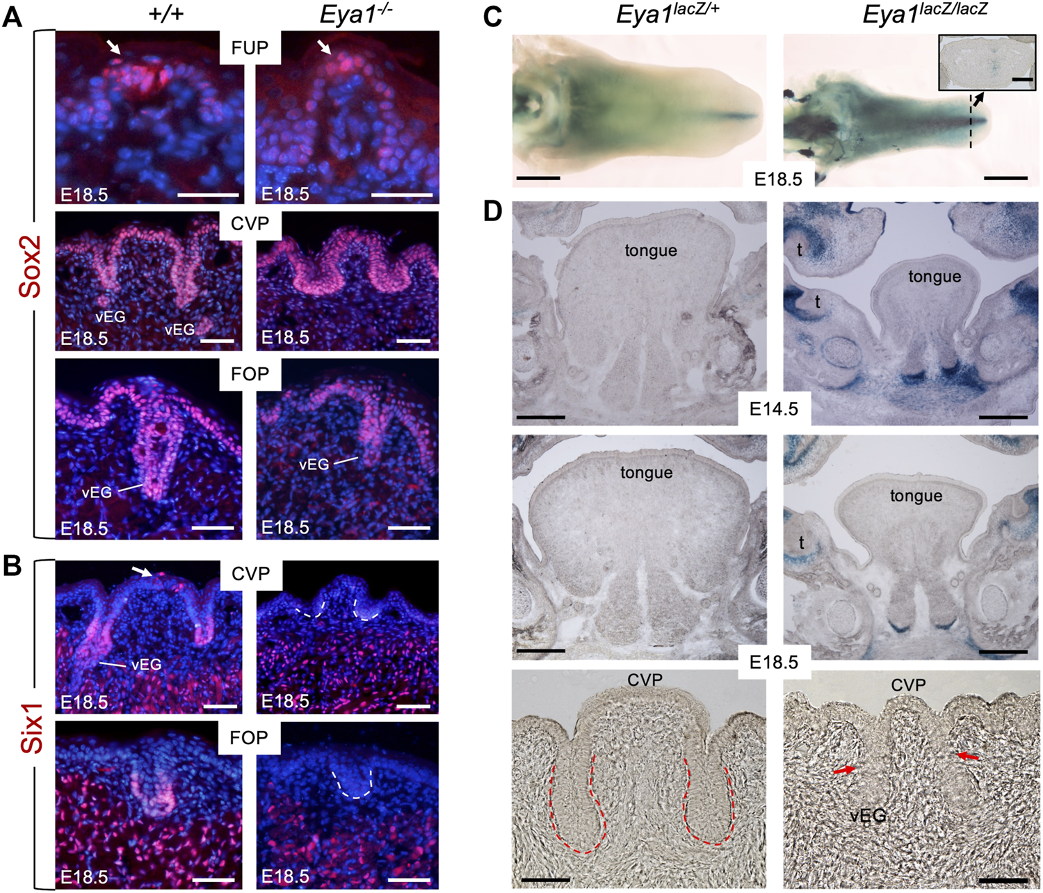 FIGURE 2. Loss of Six1 expression in CVP and FOP in Eya1-deficient tongues and absence of Eya1 expression in embryonic tongues. (A) Immunostaining on frontal sections showing Sox2 expression in E18.5 wild-type and Eya1−/− FUP, CVP and FOP regions. Arrows indicate well-developed taste buds with clustered cells in wild-type FUP but not in Eya1−/−. (B) Immunostaining on frontal sections showing Six1 expression in CVP epithelium (arrow) and trenches, FOP trenches, von Ebner’s gland and muscle cells in E18.5 wild-type, but its expression in the papilla and trench epithelium is lost in Eya1−/−. (C) Whole-mount X-Gal staining of Eya1LacZ/+ and Eya1LacZ/LacZ tongues at E18.5. (D) Frontal sections showing X-Gal staining of Eya1LacZ/+ and Eya1LacZ/LacZ tongues at E14.5 and E18.5. Red arrows point to the end of the trench epithelium, which was followed by a cluster of epithelial cells. Abb.: t, tooth; vEG, von Ebner’s gland. Scale bars: 30 μm (for top panels of FUP in A), 50 μm (for CVP and FOP in A,B), 1 mm (C) and 300 μm (D).