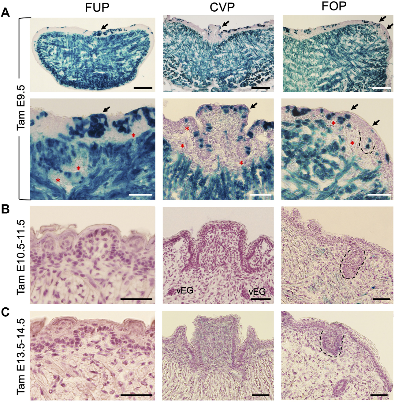FIGURE 3. Lineage tracing reveals the contribution of Eya1-expressing progenitors before E10.5 to tongue epithelium, taste papillae, and tongue musculature. (A–C) X-Gal stained frontal sections of Eya1CreER;R26RLacZ at E17.5–18.5 showing labeled cells in the tongue muscles, lingual epithelium, and taste papilla regions when tamoxifen (tam) was administered at E9.5 (A), but not at E10.5 and 11.5 (B) or E13.5 and 14.5 (C). Bottom panels in A show a higher magnification of areas indicated by arrows. The FOP was outlined by dashed lines. Red asterisks indicate unmarked mesenchymal cells. Abb.: vEG, von Ebner’s gland. Scale bars: 200 μm for the top panels in A and 50 μm for all other panels.