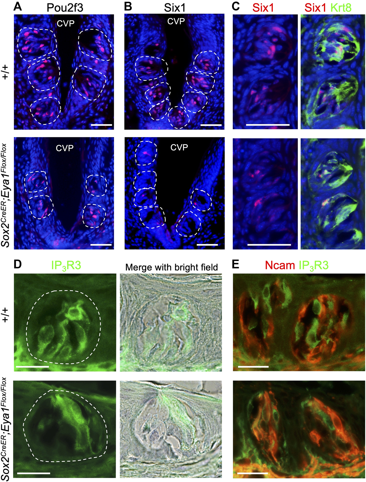 Primary antibodies used were before IHC rabbit anti-Sox2 (PA1-094, ThermoFisher), rabbit anti-Six1 (50-204-6211, Cell Signaling), mouse anti-TUBB3 (66375-1-Ig, Proteintech), rabbit anti-β-Gal (08559761, MP Biomedicals), rabbit anti-Pou2f3 (PA5-40556, ThermoFisher), mouse anti-IP3R3 (610312, BD Biosciences), rabbit anti-Ncam (ab220360, Abcam), and mouse monoclonal Keratin 8 (Krt8) (NBP2-44940, Novusbio). Cy3-or Cy2-conjugated secondary antibodies were used. Nuclear staining was performed using Hoechst 33342.
