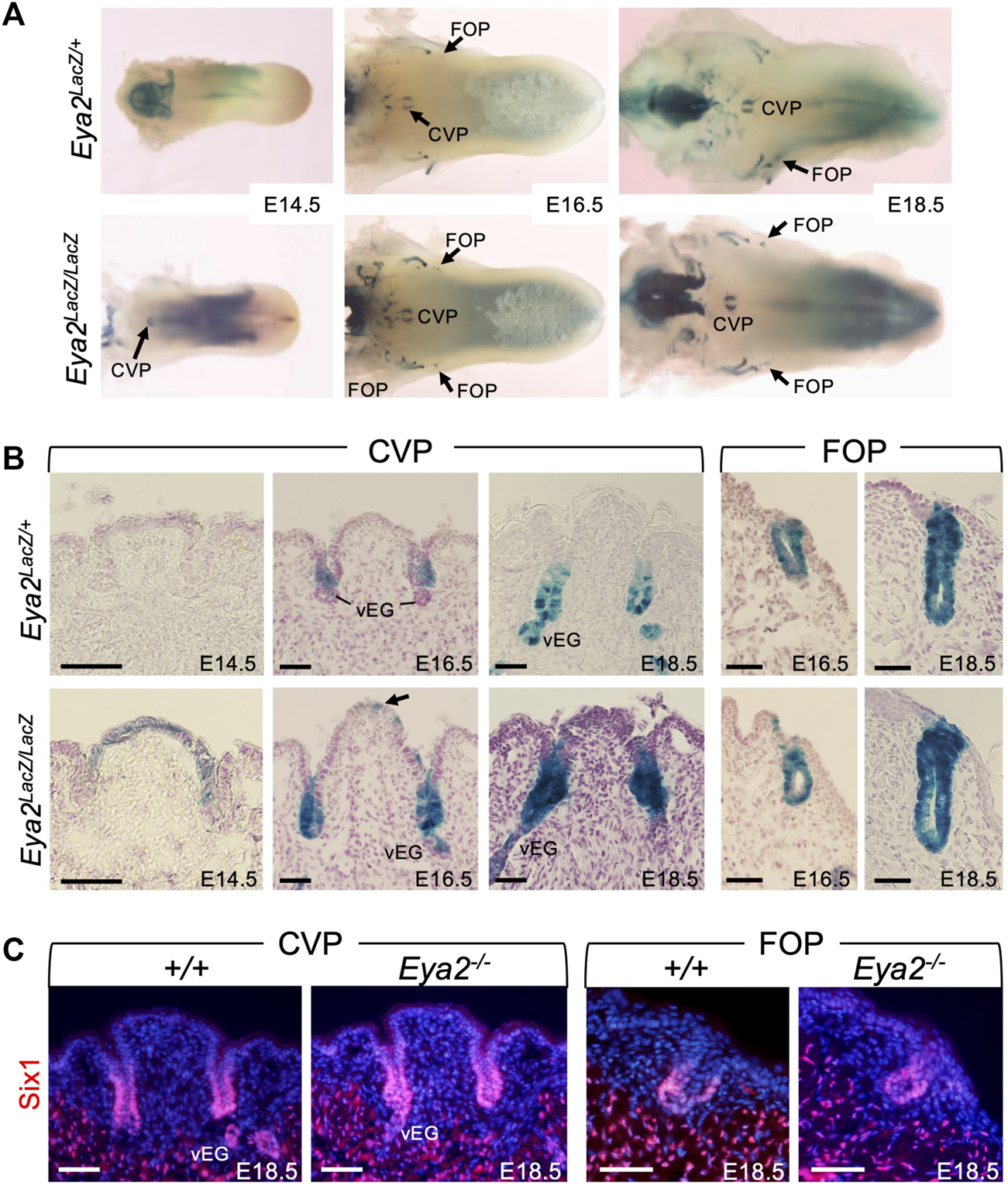FIGURE 7. Eya2 is expressed in the epithelium of CVP and FOP from the onset of papilla morphogenesis. (A) Whole-mount X-Gal staining of tongues from Eya2LacZ/+ and Eya2LacZ/LaZ at E14.5, E16.5, and E18.5. (B) Frontal sections of whole-mount X-Gal stained tongues showing β-Gal activity the CVP epithelium and trenches, FOP trenches, and von Ebner’s gland in Eya2LacZ/+ and Eya2LacZ/LacZ respectively. (C) Immunostaining on frontal sections showing Six1 expression in the trenches of CVP and FOP of wild-type and Eya2-null tongues at E18.5. Scale bars: 50 μm.
