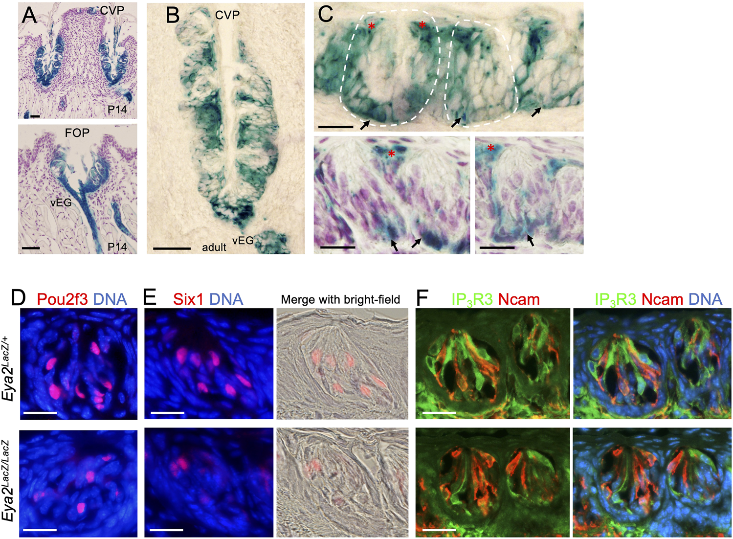 FIGURE 8. Eya2 is expressed in the CVP and FOP taste buds, and Eya2-deficient mice show a reduced number of Type II taste cells. (A, B) X-Gal staining on sections showing broad expression of Eya2LacZ in the CVP and FOP trench epithelium at P14 (A) and the adult CVP trench epithelium (B). (C) Higher magnification showing β-Gal+ cells in some basal progenitors (arrows) and cells surrounding the taste pore (red asterisks) and inside the taste buds. Some sections were counterstained with diluted hematoxylin (A and two lower panels in (C). (D–F) Immunostaining for Pou2f3 (D), Six1(E), and co-immunostaining for IP3R3/Ncam (F) in wild-type control and Eya2-deficient adult taste buds. Scale bars: 50 μm (A, B) and 20 μm (C–E).