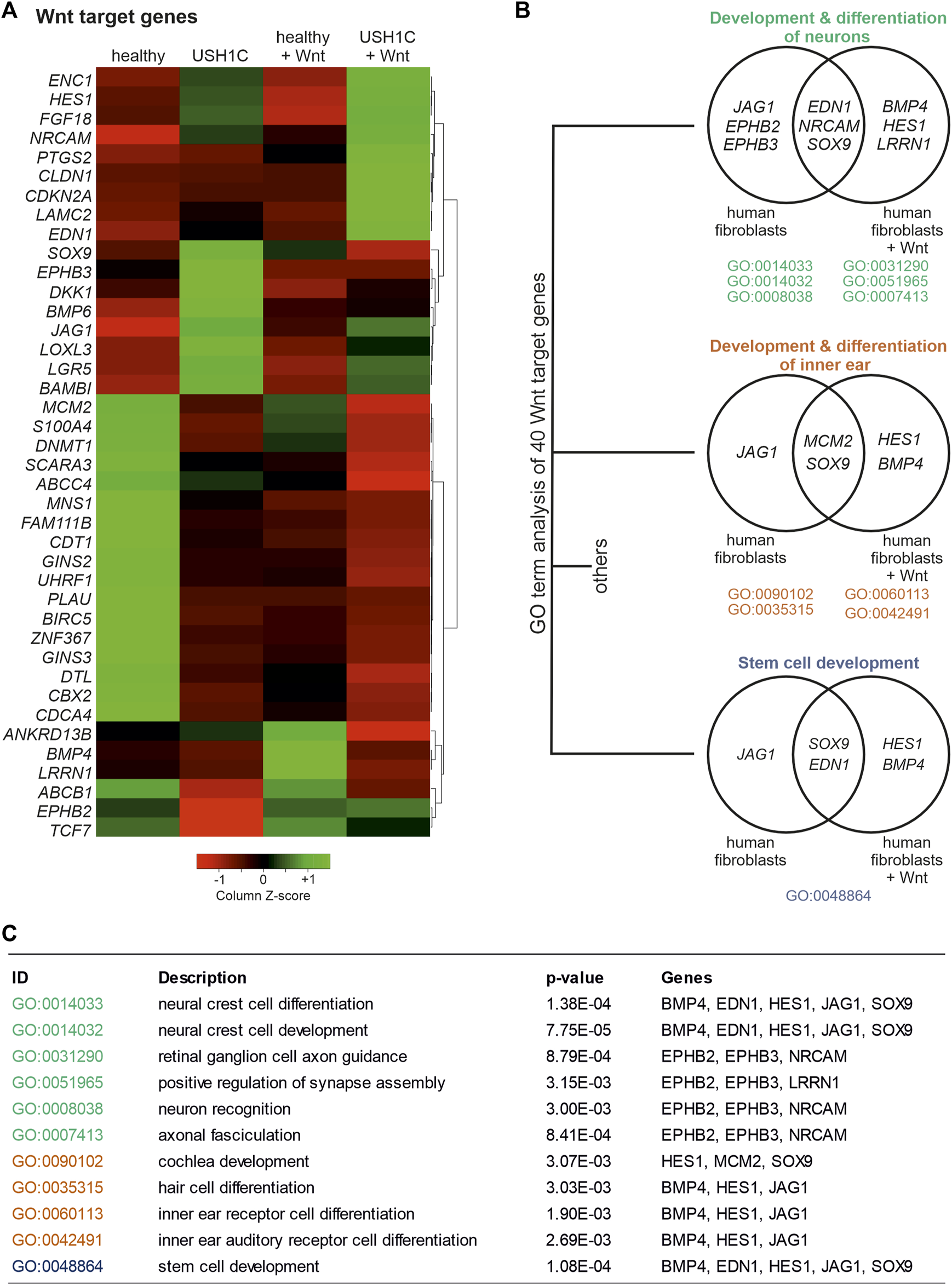 RNAseq analysis uncovers differential expression of Wnt target genes in USH1CR31*/R80Pfs*69 patient-derived fibroblasts. (A) Heatmap shows transformed FPKM-values scaled by z-score identifying 40 differentially regulated Wnt target genes in unstimulated and Wnt stimulated healthy (column 1 and 3) and USH1CR31*/R80Pfs*69 patient-derived (USH1C) fibroblasts (column 2 and 4). Red areas correspond to a relative downregulation in gene expression, whereas green areas represent a relative upregulation. (B) GO enrichment analysis showing dysregulated Wnt target genes to be critical for distinct biological processes, such as “development and differentiation of neurons,” “development and differentiation of the inner ear,” as well as “stem cell development.” (C) Detailed description of GO terms summarized in (B).