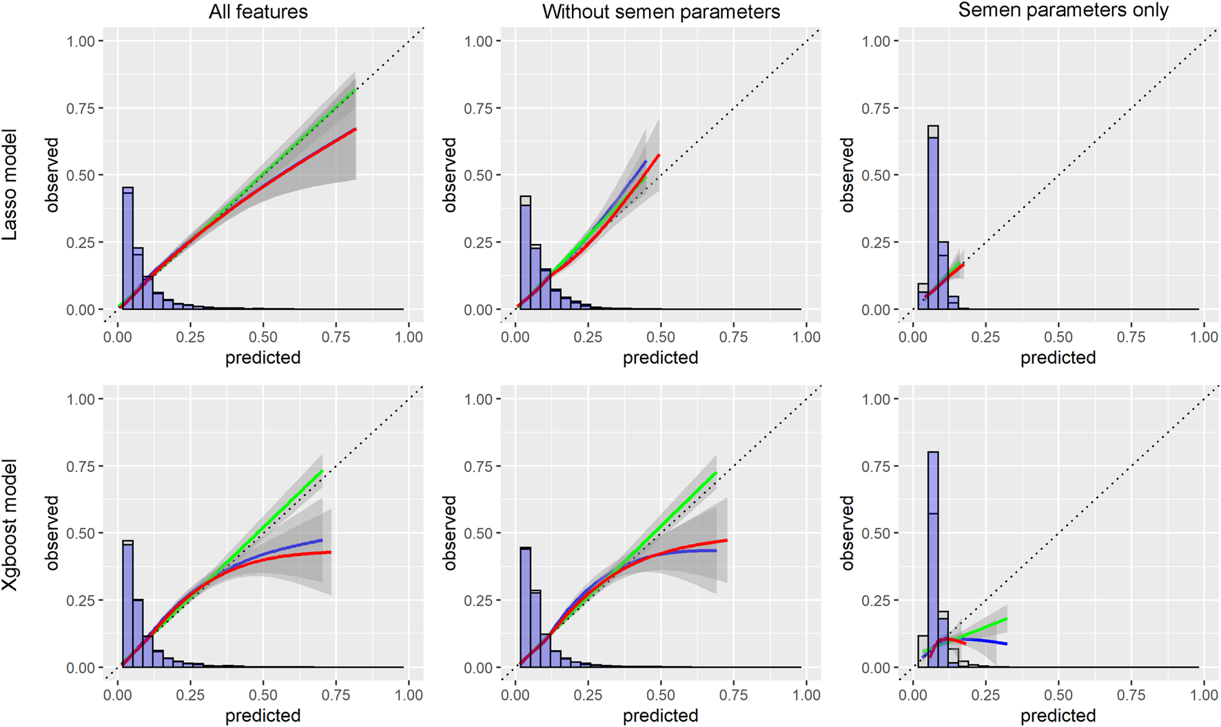| LASSO | Xgboost | LASSO without semen parameters | Xgboost without semen parameters | LASSO with semen parameters only | Xgboost with semen parameters only | |