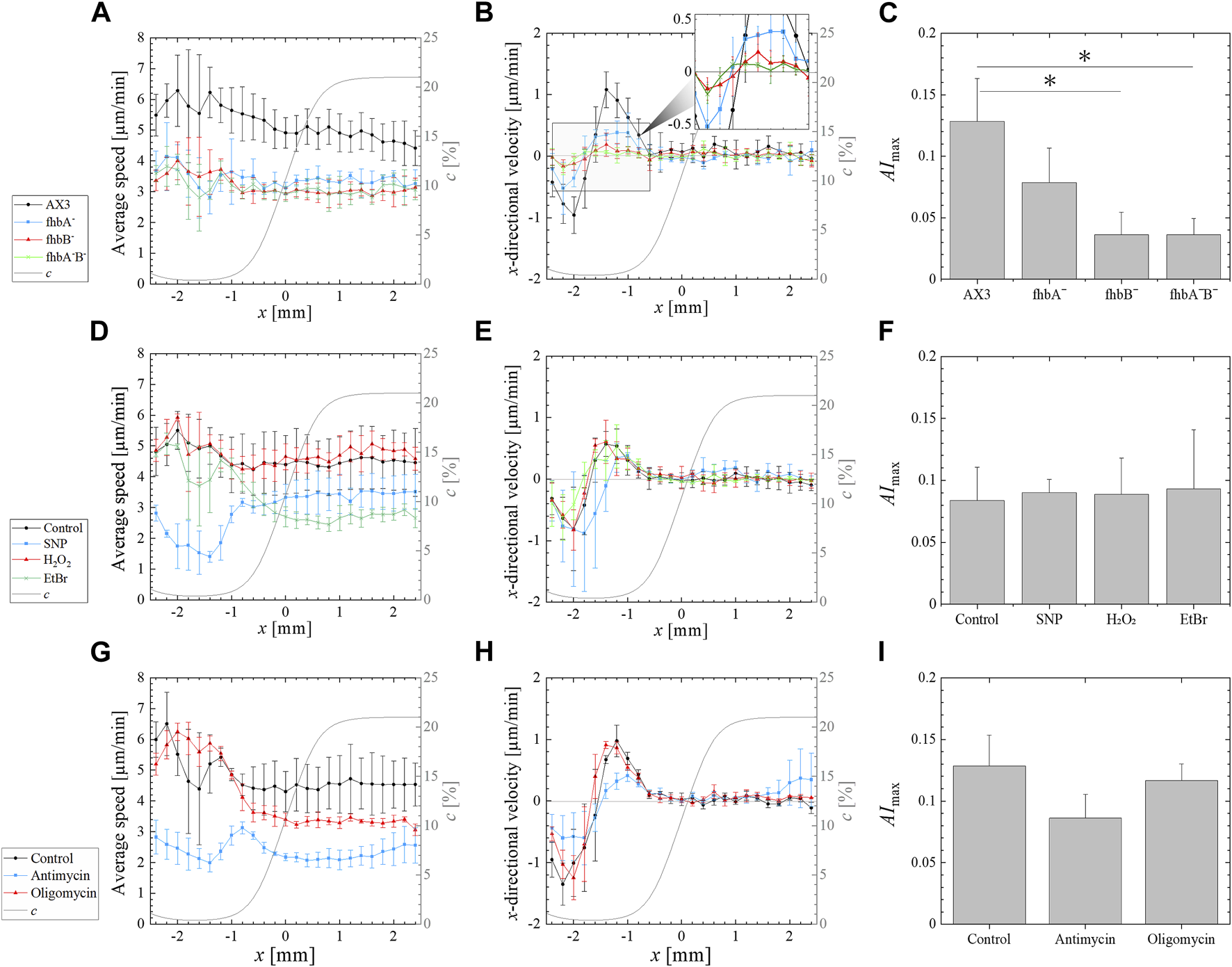 Effect of various treatments on the aerotactic response of Dictyostelium to an imposed 0.4%–21% external oxygen gradient (left to right) generated by supplying pure nitrogen and air to the gas channels of a double-layer microfluidic device. (A,D,G) Average speed (i.e., absolute value of the displacement per minute) vs. the position x along the gradient direction. (B,E,F)x-directional velocity (i.e., displacement along gradient direction per minute) vs. the position x along the gradient direction. The computed profile of oxygen concentration c is overlapped (gray solid line) on these profiles showing the oxygen gradient from 0.4% O2 to 21% O2 (right axis). (C,F,I) Maximal (positive) value AImax of the average aerotactic index. The values and error bars on profiles and on AImax are means and standard deviations over independent experiments. Significant differences were assessed by one-way ANOVA followed by Tukey’s post hoc test for multiple comparisons. *p < 0.05. The various experimental conditions are the following. (A–C) Response of fhb null mutants and associated AX3 parent cell line (N = 3 for fhbA- and fhbA-B-, N = 6 for fhbB- and AX3). (D–F) Effect of SNP, H2O2 and EtBr on the AX2 control strain (N = 3 for SNP, H2O2 and EtBr treated cells, N = 9 for the control AX2). (G–I) Effect of oligomycin or antimycin treatment on the migration of the control AX2 cells (N = 3 for all conditions).