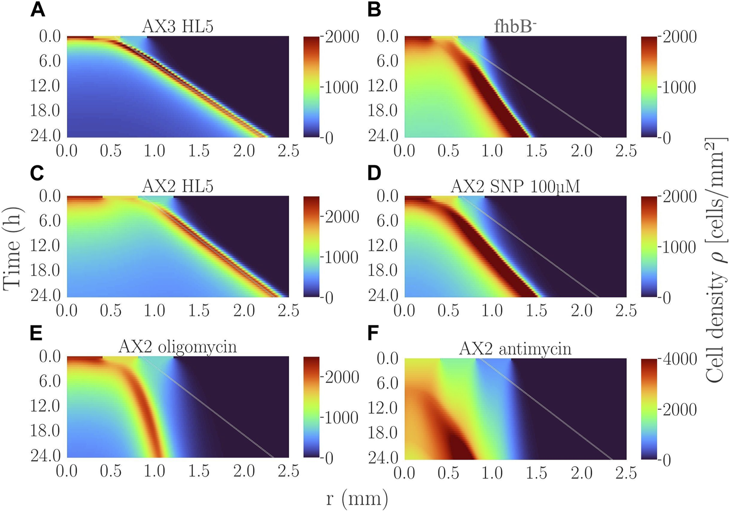 Simulated kymographs of cell density for the various experimental conditions presented in this study: (A) AX3 control with 2,000 cells initially plated; (B)fhbB- cell line with 2,000 initial cells; (C) AX2 control cell line with 5,000 initial cells; (D) AX2 cells treated with 100 µM SNP (2,000 initial cells); (E) AX2 cells treated with oligomycin (5,000 initial cells); (F) AX2 cells treated with antimycin (5,000 initial cells). The line in (B) is the slope of the ring-band of (A). The lines in (E,F) are the slope of the ring-band of (C). The line in (D) comes from the corresponding control AX2 at low initial density not shown. See Supplementary Table S1 for the experimental parameters used.