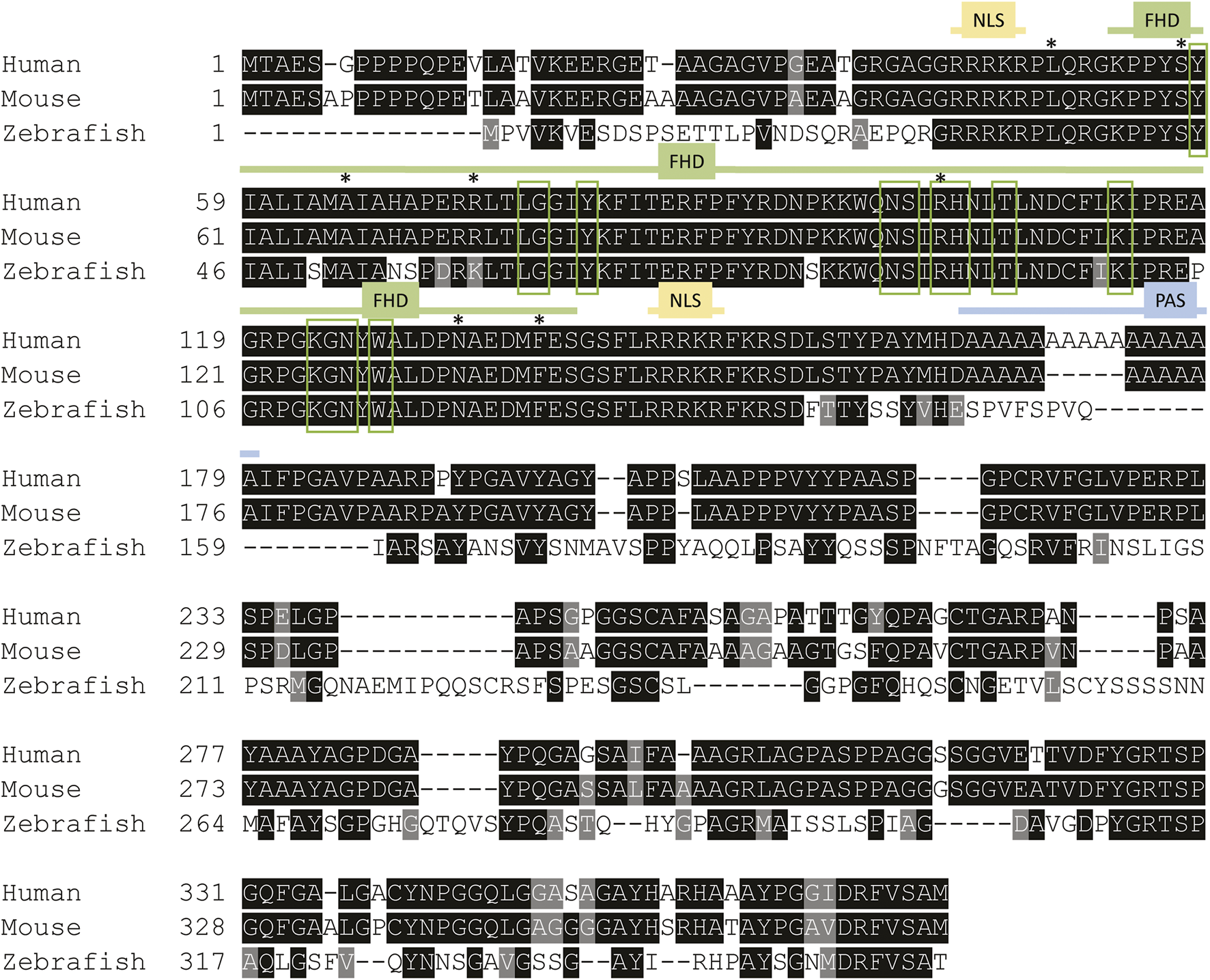 Foxe1 protein structure in human, mouse and zebrafish. Multiple sequence alignment of full-length human, mouse and zebrafish FOXE1 protein. The protein contains three characterized domains which are annotated with colored lines. The similarity of the Forkhead domain (FHD) is 97% and 100%, respectively, between zebrafish and humans and between mouse and human. The sequence similarity of the whole protein between human and zebrafish is 54%. NLS is 100% identical between all species and the poly alanine stretch (PAS) is only present in humans and mouse. Red boxes mark the putative DNA-binding residues and asterisks (*) mark locations of missense mutations that were reported in individuals with Bamforth–Lazarus syndrome (Clifton-Bligh et al., 1998; Castanet et al., 2002; Baris et al., 2006; Castanet and Polak 2010; Carre et al., 2014; Sarma et al., 2022). NLS: nuclear localization signal, FHD: forkhead box domain PAS: poly alanine stretch in human and mouse FOXE1. Alignment made using Clustal Omega.
