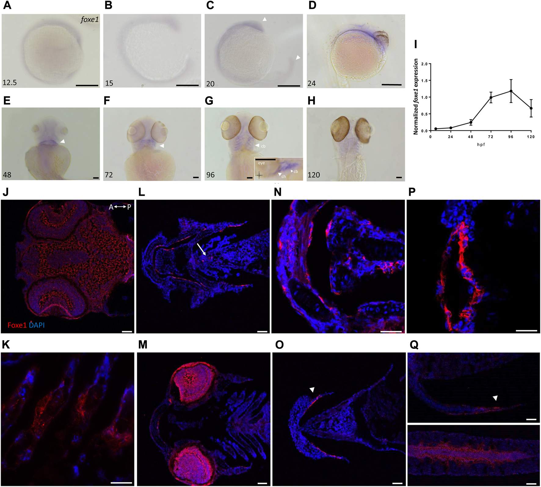 Foxe1 is expressed in a range of larval tissues, including the oral epithelium, ethmoid plate, and the brain. (A–H)foxe1 transcripts were detected diffusely throughout the embryo from early development at 12.5 hpf (A) which continued through early larval stages (B–D) where transcripts also seemed specifically upregulated in the subpharyngeal area (E, F) before being enhanced in the ceratobranchials and ceratohyal ((G), insert lateral view). (A-D) lateral view and (E-H) ventral view. (I) Normalized relative expression of foxe1 during embryonic and larval stages as determined by qPCR. Error bars indicate standard deviations. (J-Q) Detailed protein localization at 96 hpf showed Foxe1-positive cells in the brain (J), the ceratobranchials (K), in the oral epithelium and in a linear cluster in the subpharyngeal area (white arrow) (L), the eyes (M), on the ethmoid plate (N), on the lining of the ceratohyal (O), in the mouth opening (P) and to some extent in the fin tips (Q), upper image) and in the notochordal sheath ((Q), lower image). Posterior-anterior axis in J applies to all images. cb: ceratobranchals, ch: ceratohyal. A-H scalebar 100 μm, (J-Q) scalebar 50 µm. Antibody validation in Supplementary Figure S1.