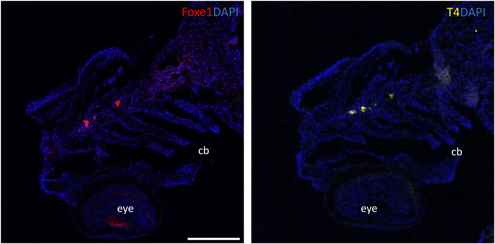 Foxe1 and T4 are colocalized in the subpharyngeal area. Foxe1 and T4 staining on adjacent coronal sections of the subpharyngeal area of the larval head. T4 and Foxe1 staining in the developing thyroid follicles at 96 hpf. Nuclear counterstain with DAPI. cb; ceratobranchials, e; eye. Scale bar 200 µm.
