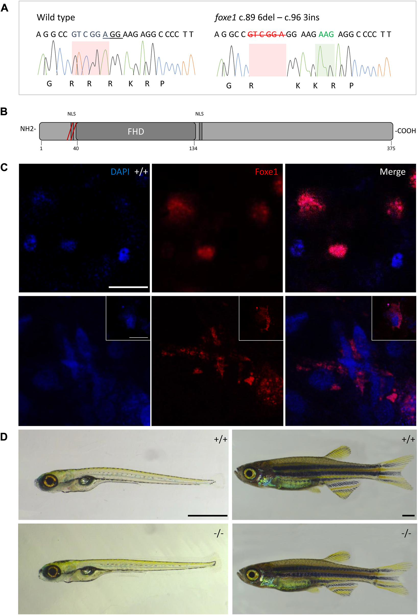 The foxe1rdb2 mutant. (A) Wild type and foxe1rdb2 mutant DNA sequence at (C) 84–105. The protospacer adjacent motif is underlined (full gRNA sequence: 5′-GCCGCAAAGAGGCCGTCGGAGG-3′). The deletion is highlighted in red and the insertion in green. (B) Schematic representation of the zebrafish Foxe1 protein and the position of the amino acid changes as indicated by the red bars. (C) Nuclear localization of wild type Foxe1 and cytoplasmatic localization of mutant Foxe1 in zebrafish keratinocytes on scale. Scale bar 50 µm. (D) Representative images of wild types and foxe1 mutants at 6 dpf and 2 months post fertilization. Scale bars 1 mm.