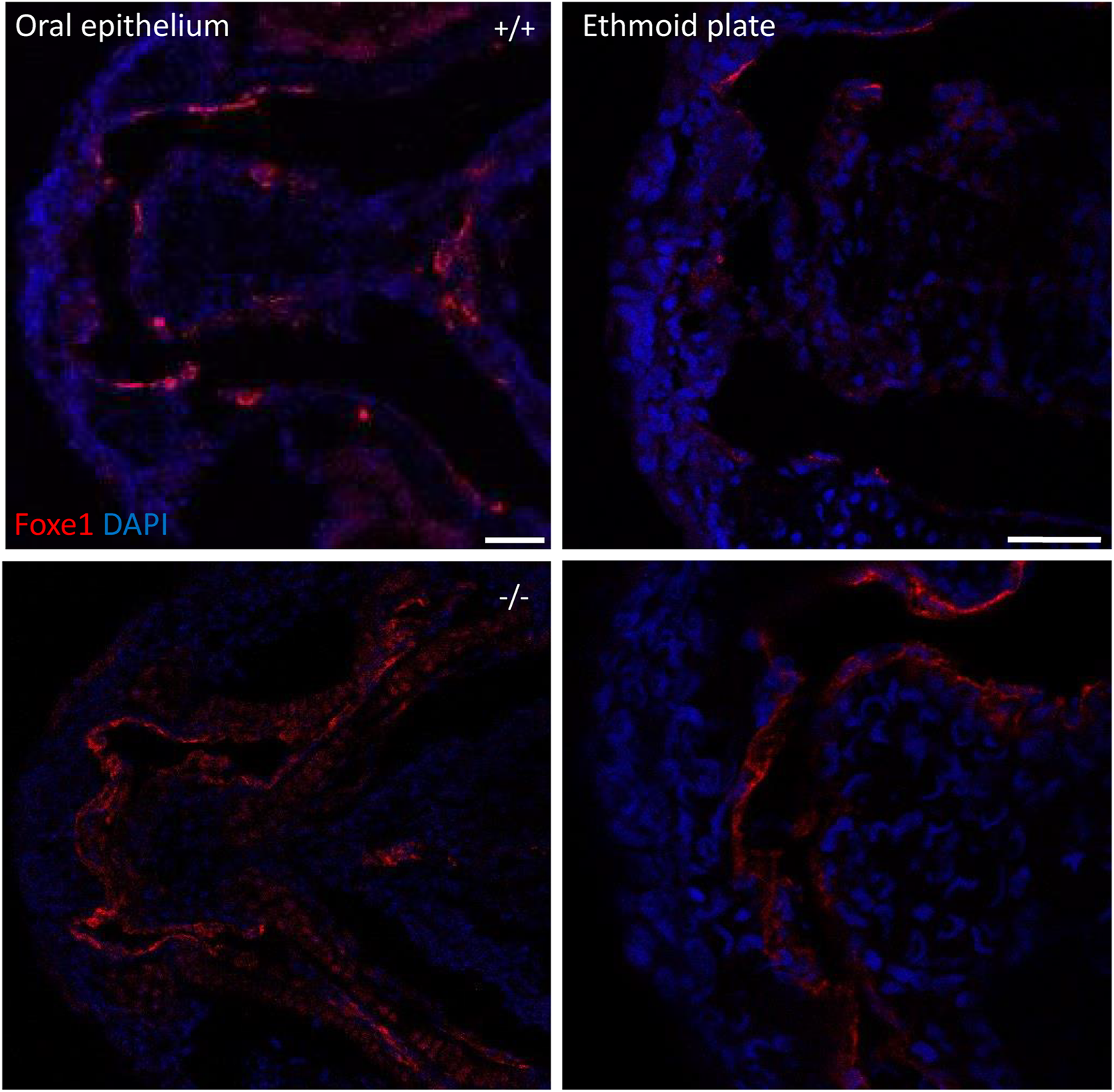 foxe1 mutants show upregulated Foxe1 expression. Foxe1 expression in the oral epithelium and the ethmoid plate of wild type and foxe1 mutants at 96 hpf. Foxe1 was more abundantly expressed in the mutants compared to the wild types, but the tissue localization of the protein remained unaffected. Scale bar 50 µm.