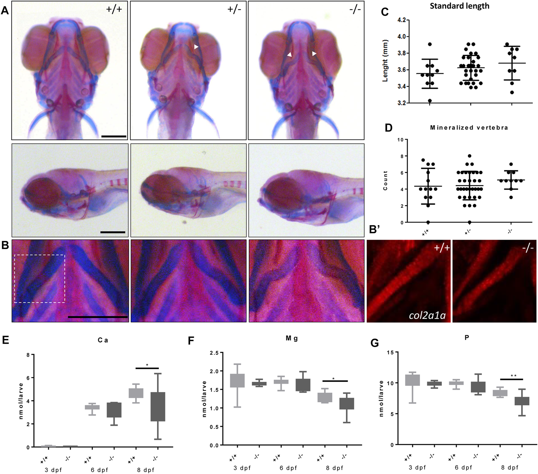 Malformed ceratohyal cartilage and reduced content of Ca, Mg and P in foxe1 mutants. (A) Representative images of wild types and foxe1 heterozygous- and homozygous mutants, ventral and lateral view. (B) High magnification images of ceratohyal phenotype. (B′)Col2a1a positive cells in the in ceratohyal. (C) Standard length at 8 dpf. (D) Count of mineralized vertebrae in foxe1 mutants versus wild types at 8 dpf. (E–G) Molar calcium, magnesium and phosphorus content in foxe1 mutants versus wild type larvae during early skeletal development three to 8 dpf. n = 10–33. Scale bar 200 µm. Data were assessed for normality with the D’Agostino-Pearson normality test. Normally distributed data were analyzed for statistical differences using a one-way ANOVA and post-hoc Tukey test or unpaired t-test. Non-parametric data were compared with a Kruskal–Wallis test with post-hoc Dunn’s Multiple comparison test or Mann-Whitney test. Error bars indicate standard deviation.