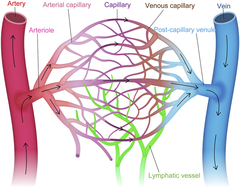 The kidney is critical for regulating the composition and volume of body fluids. The renal artery enters the kidney and divides into segmental arteries, followed by branching into interlobar arteries (Molema and Aird, 2012). The interlobar arteries give rise to arcuate arteries, cortical radiate arteries, and afferent arterioles. The afferent arterioles branch into glomerular capillaries and the glomerular capillaries, in turn, branch into a second arteriole type, the efferent arteriole. The efferent arterioles branch into the peritubular capillaries and descending vasa recta. Peritubular capillaries reabsorb most of the water and solutes entering the kidney. The descending vasa recta feed the next capillary networks, and these capillaries drain into ascending vasa recta, eventually returning the water and solutes to the renal vein.