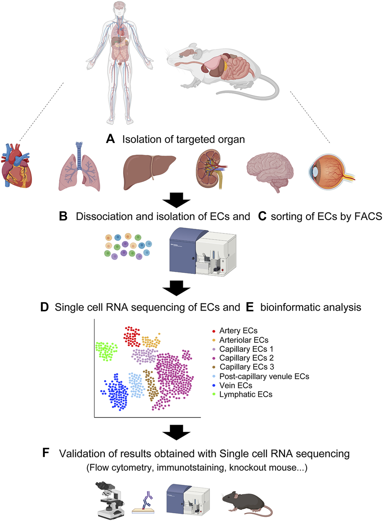 FIGURE 2. Overview of single-cell RNA sequencing. (A) Isolation of target organ. (B) Creating single cell suspension by enzymatic digestion. (C) Flow cytometric sorting of CD31-positive CD45-negative vascular endothelial cells. (D) Single cell RNA sequencing of the single cell suspension. (E) Bioinformatic analysis of the single cell transcriptomes. (F) Validation of results obtained with single cell RNA sequencing by various approaches. Created with QmlvUmVuZGVyLmNvbQ==.