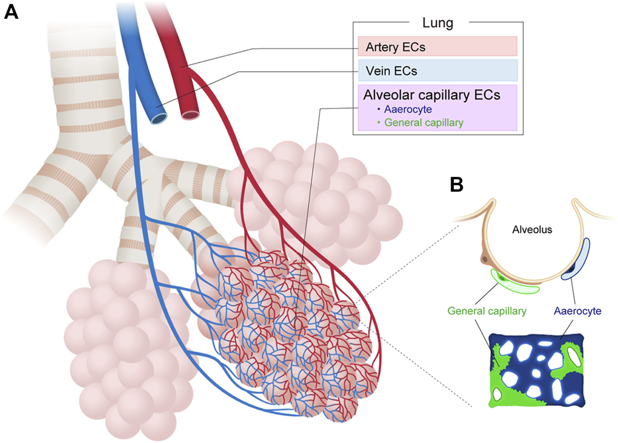 FIGURE 3. Vascular endothelial cell heterogeneity in the lung. (A) Vascular endothelial cells (ECs) in the lung can be classified into artery, vein, and capillary ECs based on their structure and molecular differences. (B) Alveolar capillary ECs are further classified into aerocytes and general capillary ECs.