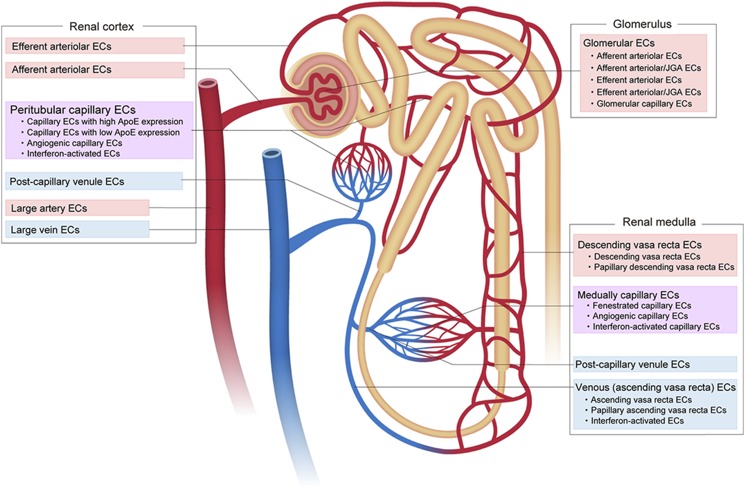 In the renal cortex, peritubular capillaries provide oxygen and nutrients, while contributing to the reabsorption and secretion of solutes and water (Molema and Aird, 2012). Nine subtypes of cortical renal ECs are recognized: 1) large arterial ECs that express Eln, Ltbp4, Mgp, Gja5, Slc8a1, Cldn5, and Kcnn4; 2) afferent arteriolar ECs that express Edn1, Gja4, Alox12, Bmp4, Cldn5, Slc18a1, S1pr1, Kcnn4, and Cxcl12; 3) efferent arterioles that express Calca, Klf4, Slc6a6 and Cryab; 4) capillary ECs that strongly express ApoE; 5) capillary ECs that show low ApoE expression; 6) post-capillary venule ECs that express Kdr, Nr2f2, Tnxb and Jup; 7) vein ECs that express Nr2f2, CD9, Gas6 and Plvap; 8) capillary ECs with an angiogenic phenotype that express Gpihbp1, Col4a1, Esm1, Col4a2, Trp53i11, Aplnr, Apln, Plk2 and Fscn1; and 9) capillary ECs that exhibit an IFN-response phenotype and express Isg15 and Ifit family genes.